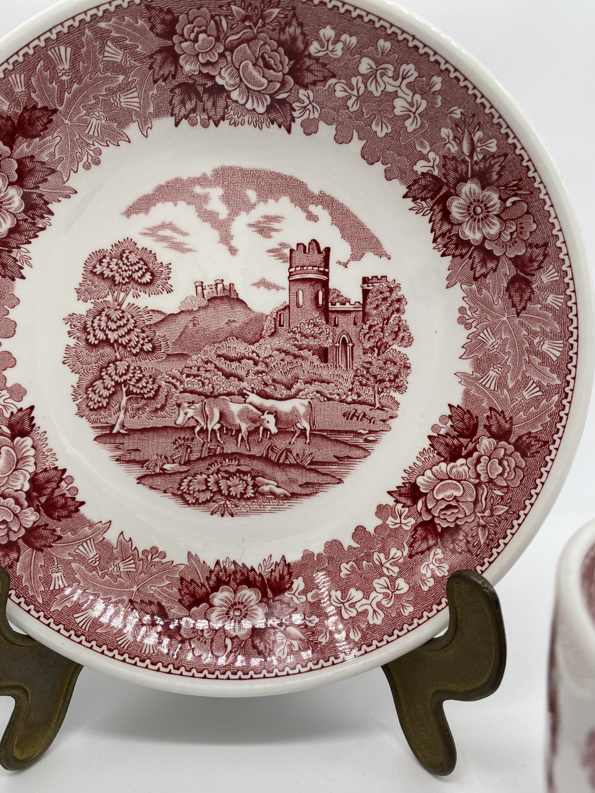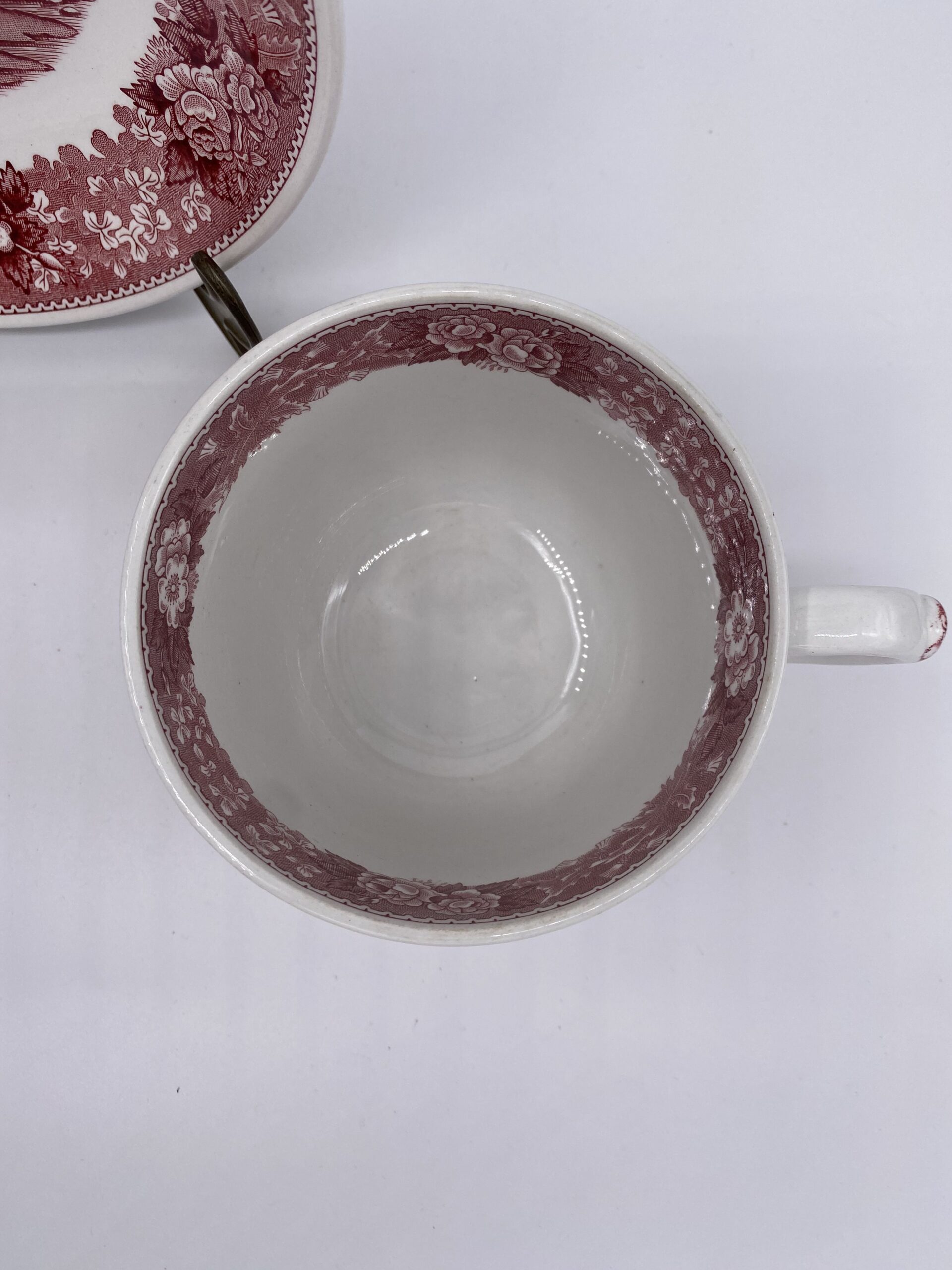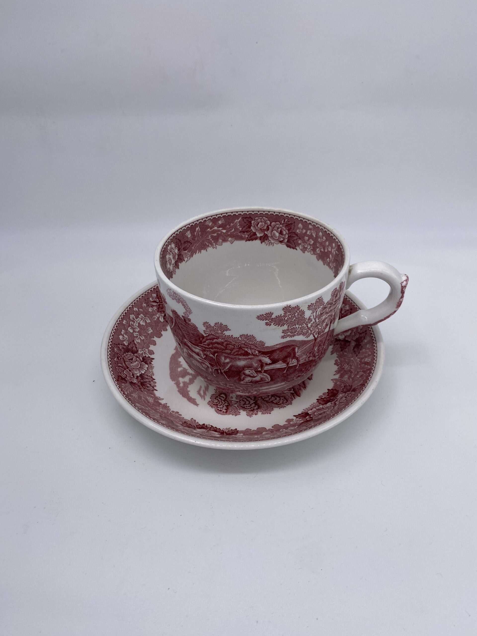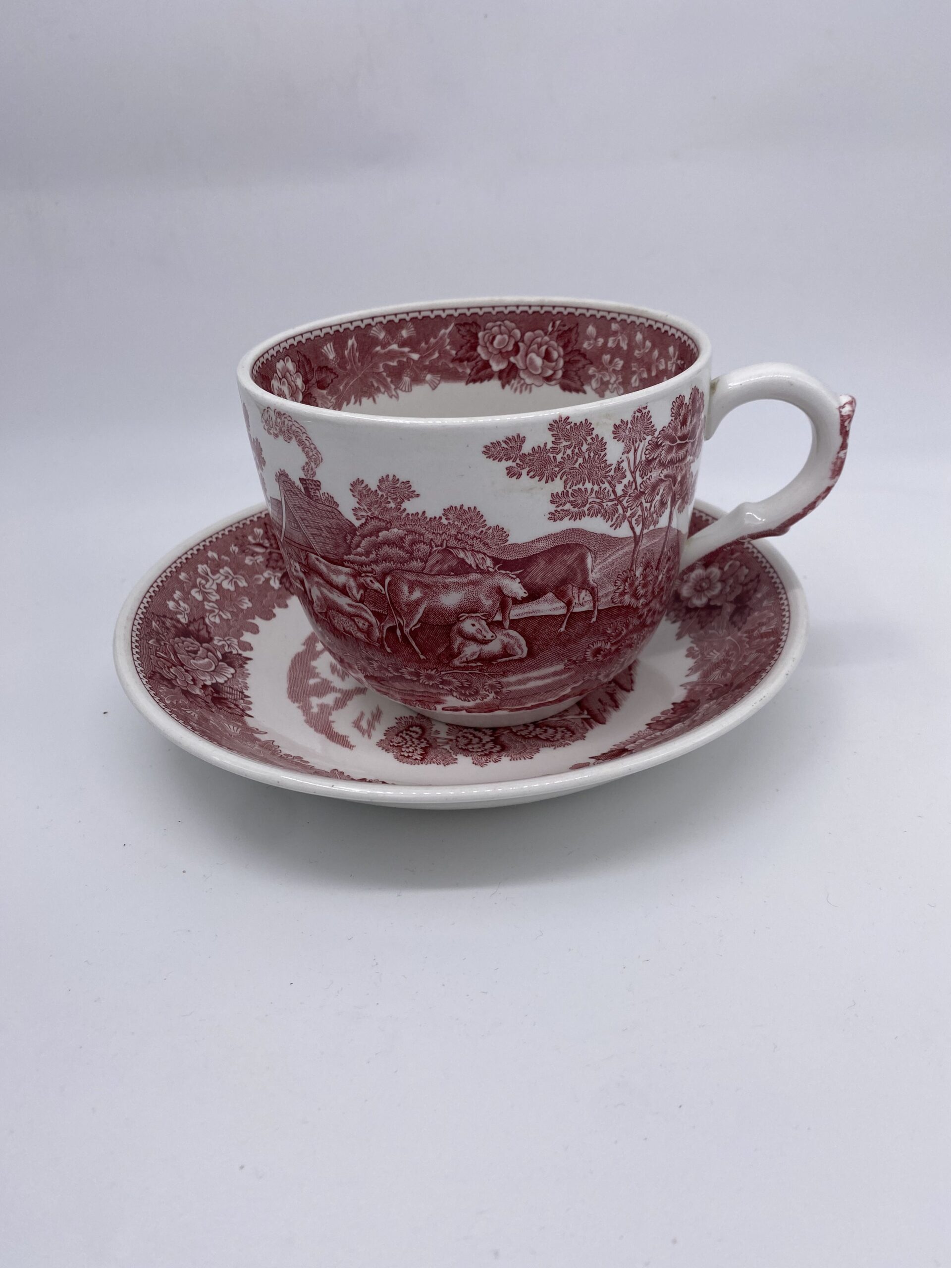 Didelės talpos vintažinis puodelis su derančia lėkštute, Adams prekinis ženklas kilęs iš Anglijos ir žinomas nuo 1657 metų. Raudono atspalvio iliustracijos vaizduoja romantišką kaimo gyvenimo sceną su gyvuliais, ant lėkštutės gėlių ir pilies motyvas. Tai tarsi subtili užuomina į ramią britišką kasdienybę senovėje. Akmens masės gaminiai žymiai patvaresni už porcelianą ar fajansą, dėl didesnio medžiagos tankio.