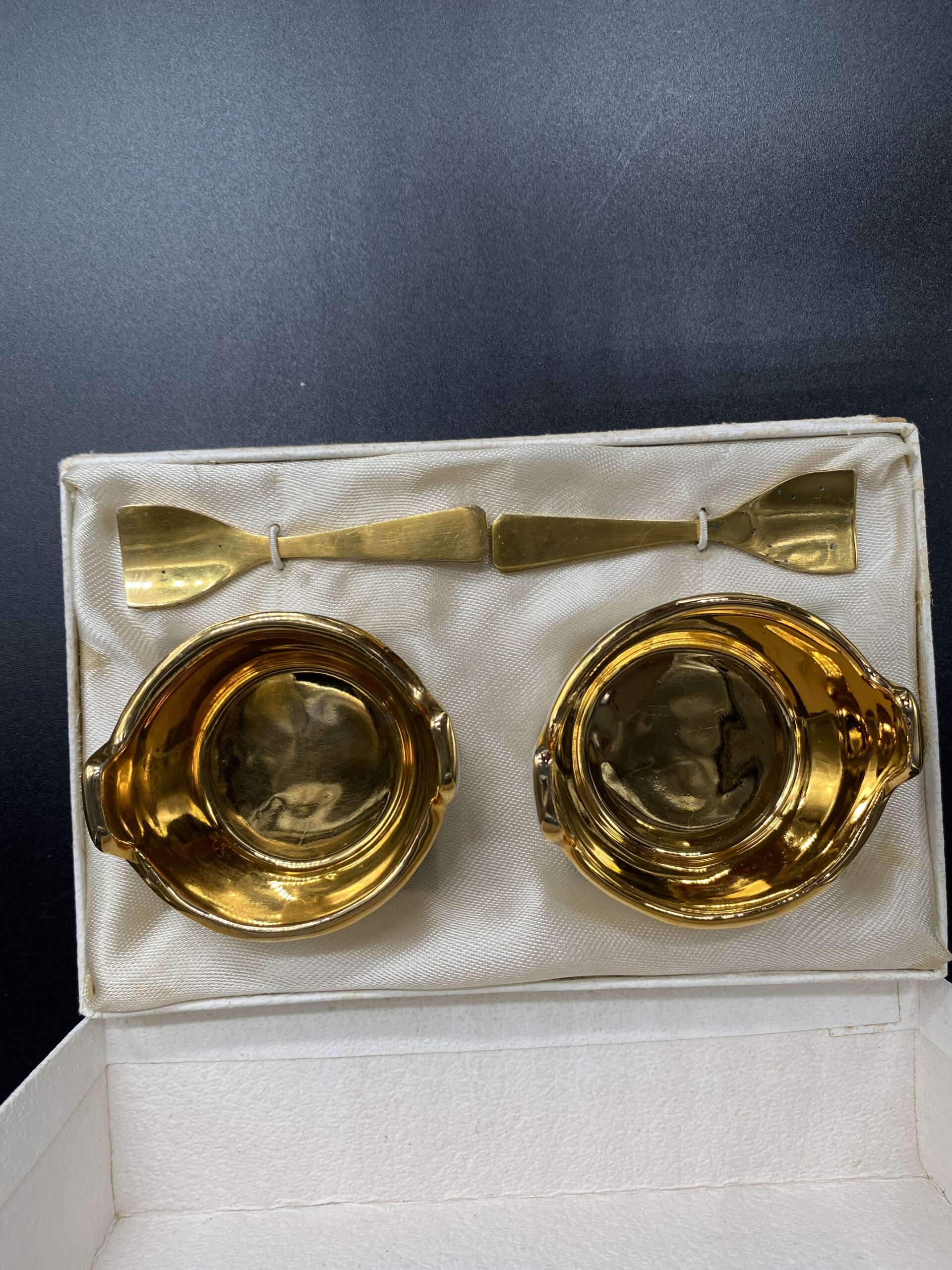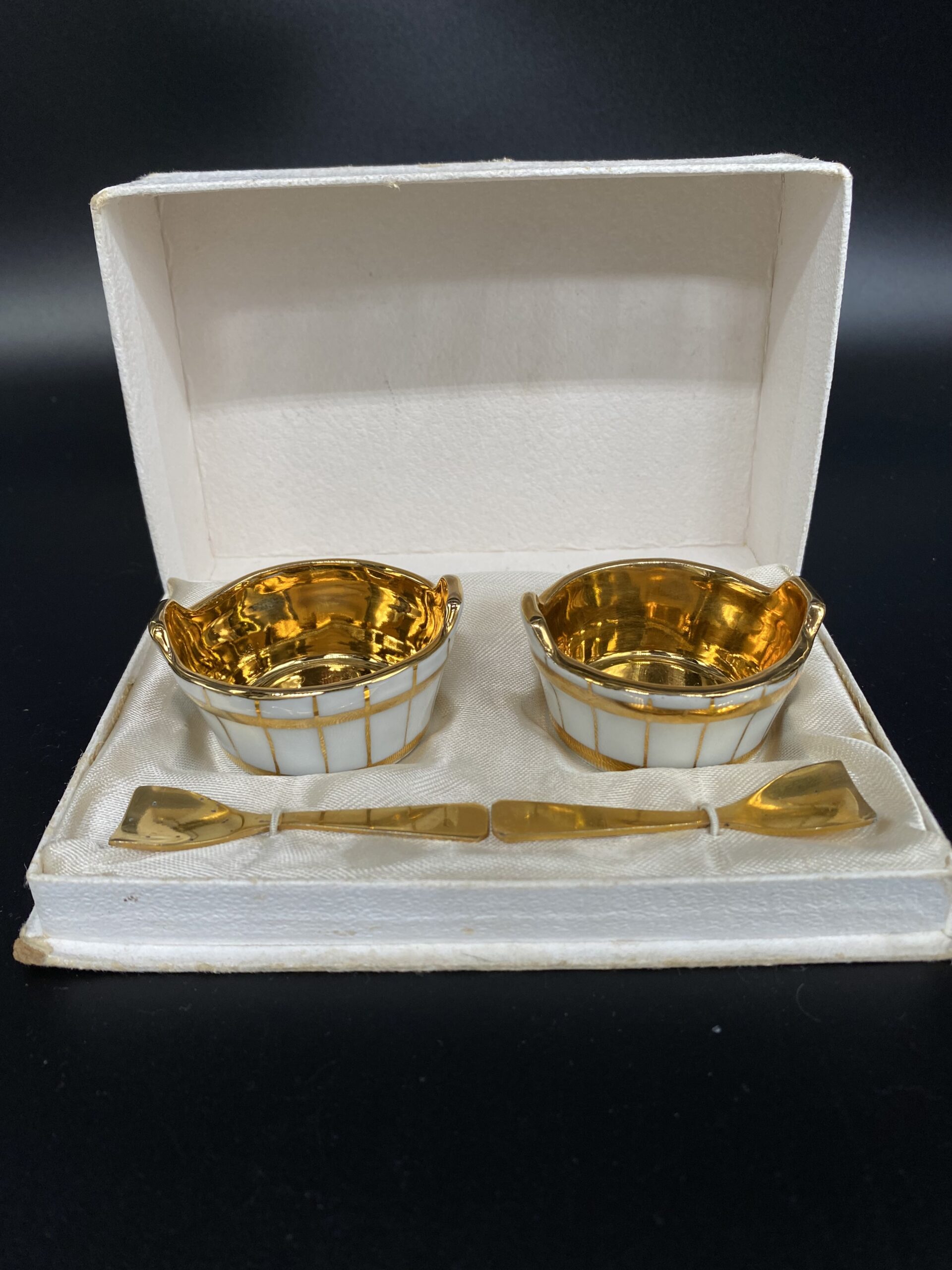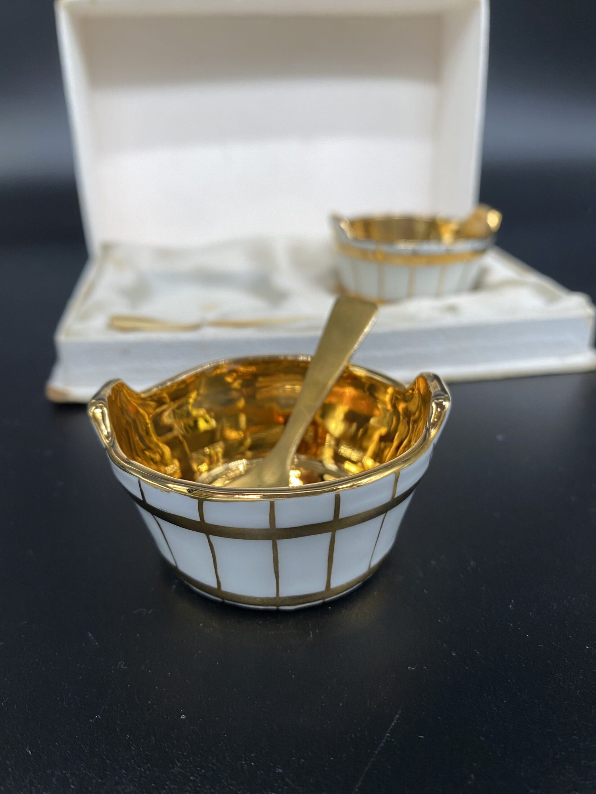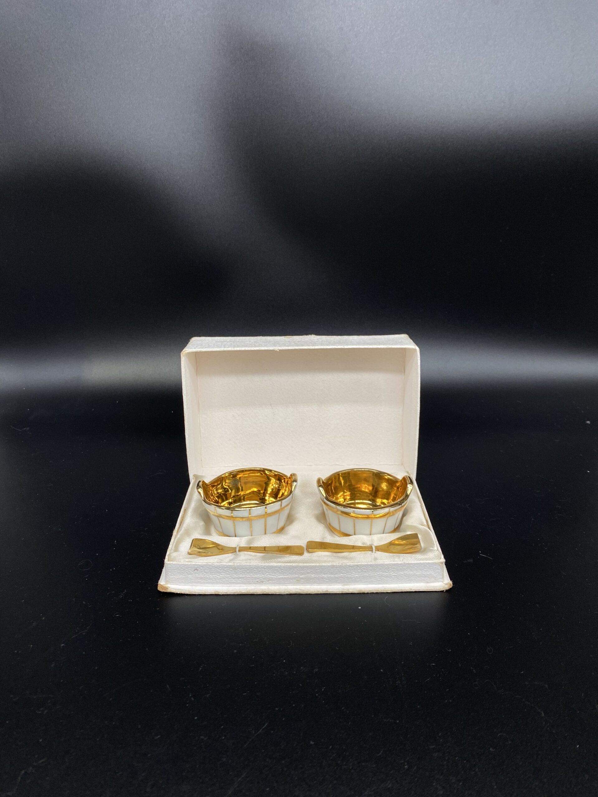 Išskirtinis Limoges porceliano rinkinys, skirtas rafinuotam stalo serviravimui. Indeliai pagaminti iš aukštos kokybės prancūziško porceliano, pasižyminčio ypatingu baltumu ir subtilumu. Vidus dengtas aukso spalvos glazūra, suteikiančia prabangos pojūtį ir saugančia paviršių, o išorė dekoruota baltais ir aukso spalvos dryžiais. Rinkinį papildo aukso spalvos šaukšteliai, užtikrinantys patogų ir estetišką naudojimą. Limoges porcelianas – tai prancūziškos meistrystės, ilgaamžiškumo ir elegancijos simbolis. Šaukšteliai turi senėjimo dėmelių.