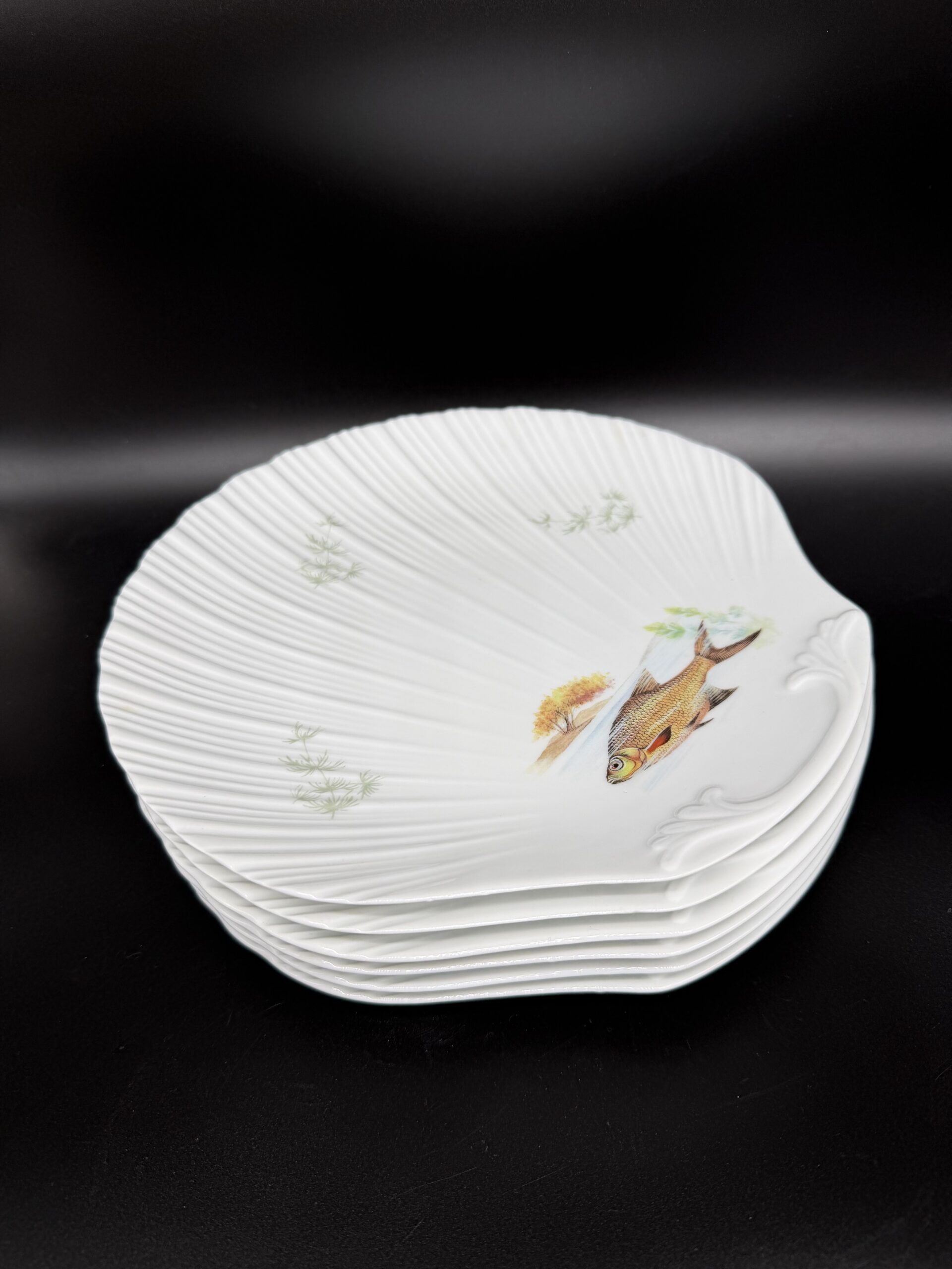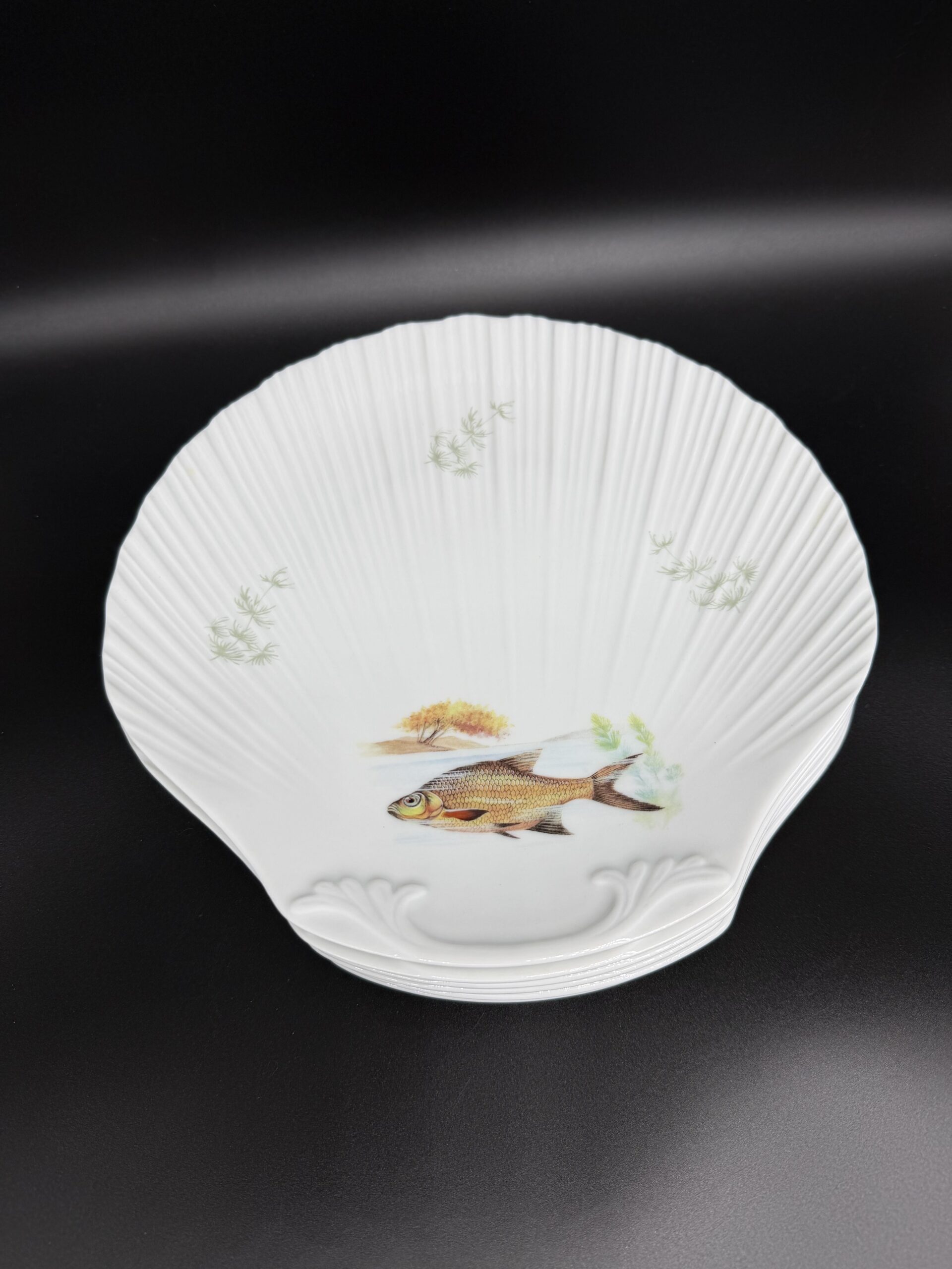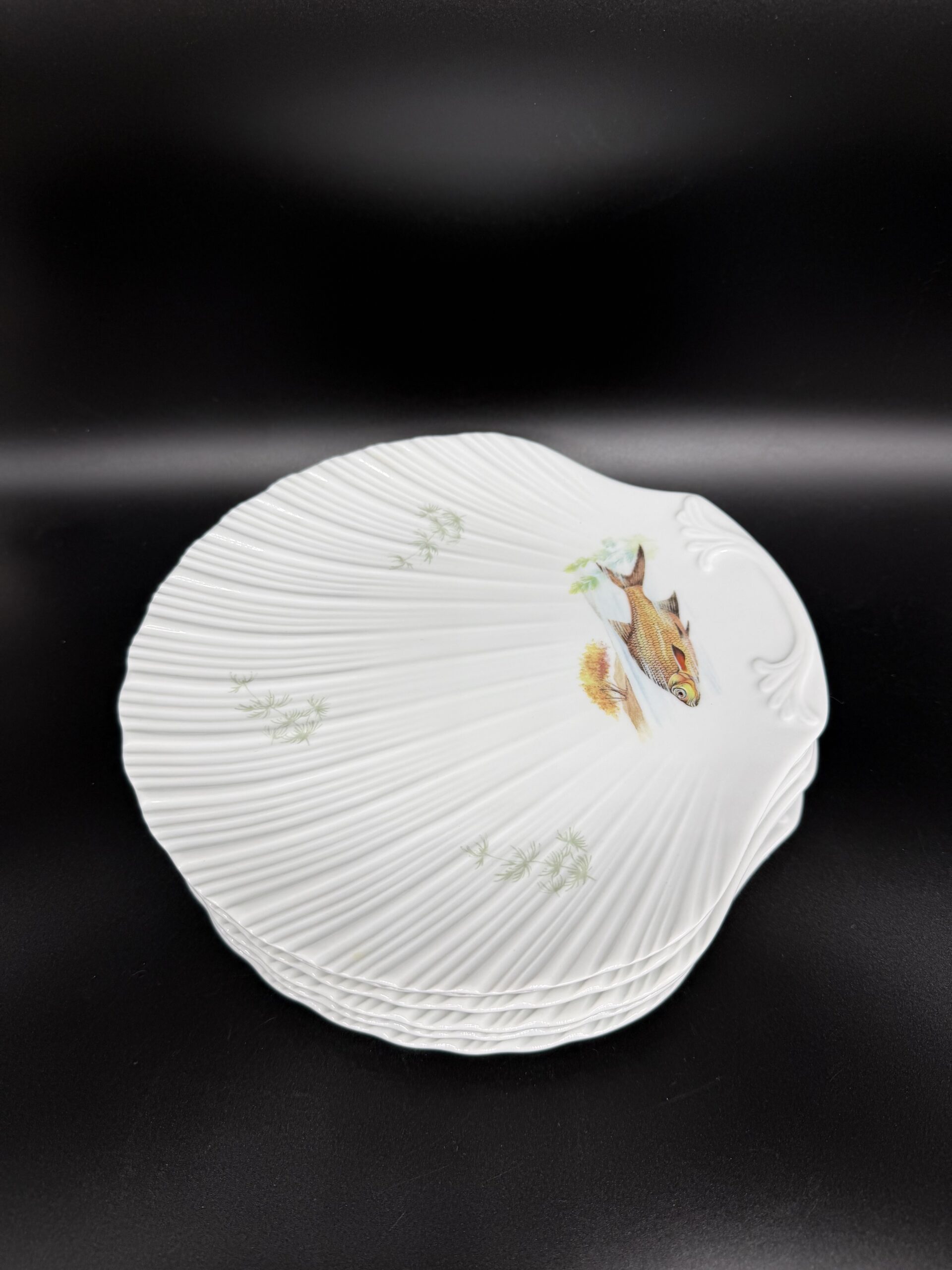 Limoges porcelianas – tai aukštos kokybės kietojo porceliano gamyba iš Prancūzijos miesto Limoges, kur porceliano gamyba pradėjo augti jau XVIII a. dėl netoli esančių kaolino klodų ir nuo tada tapo vienu žymiausių Europos porceliano centrų. Limoges porceliano kriauklės formos pietų lėkštės išsiskiria subtilia, elegantiška forma, primenančia natūralų jūros kriauklės kontūrą, ir rankomis dekoruotais žuvų motyvais. Autentiški Limoges porceliano dirbiniai yra vertinami dėl jų plono, baltos spalvos, atspindinčio šviesą, ir rafinuoto paviršiaus, kuris puikiai dera tiek kasdienybėje, tiek elegantiškose vakarienėse. Rinkinį sudaro 6 vienetai.
