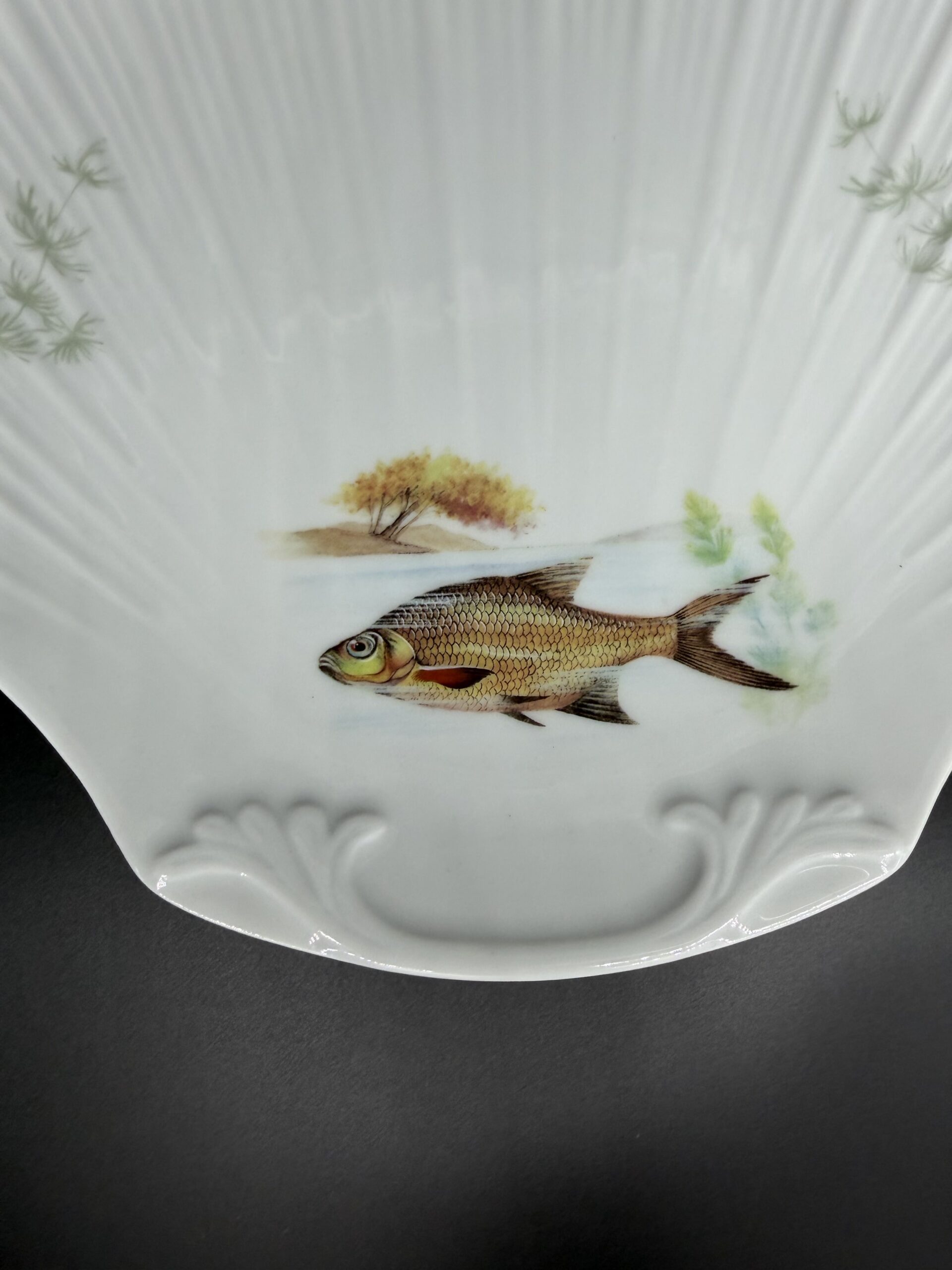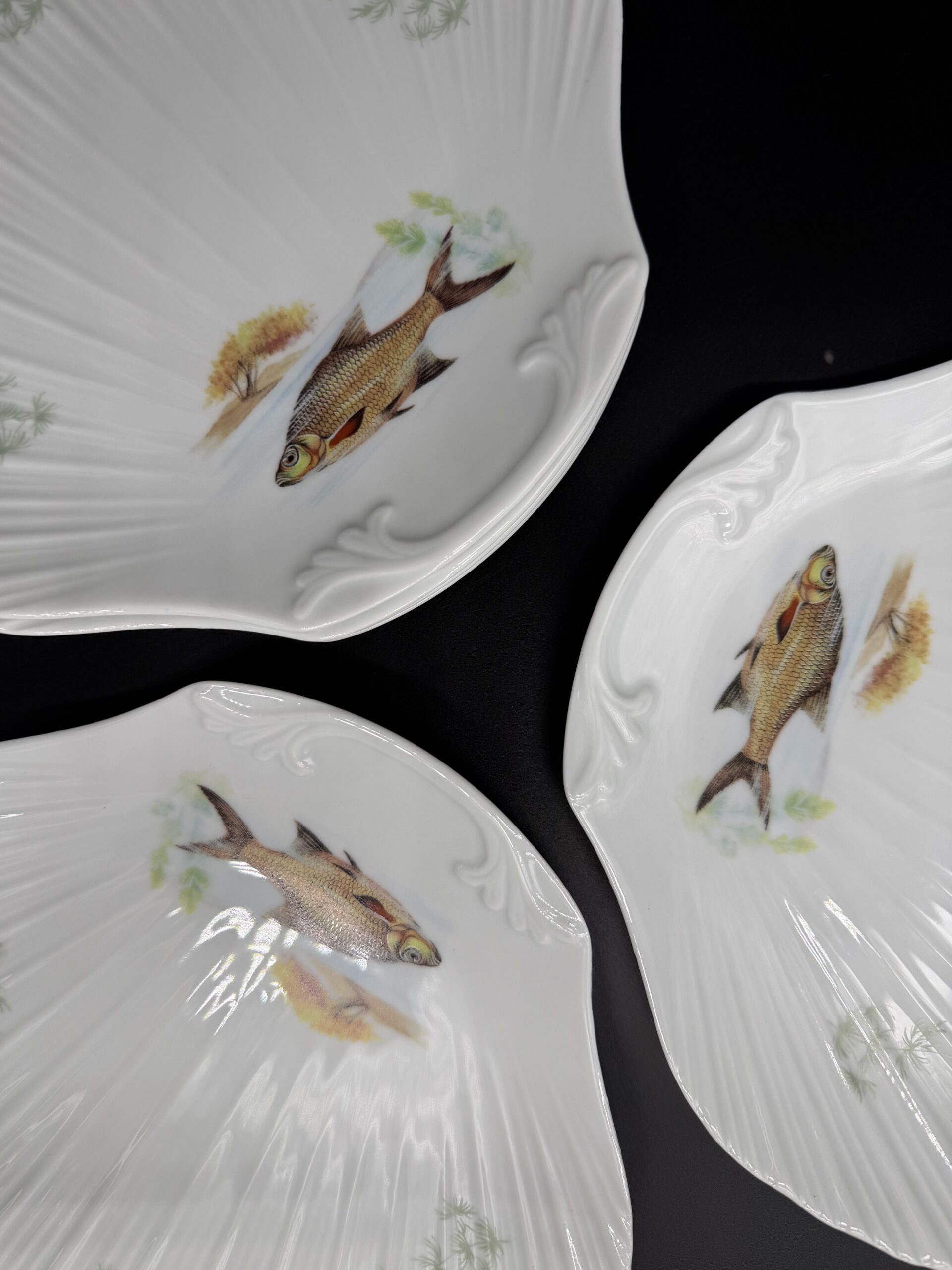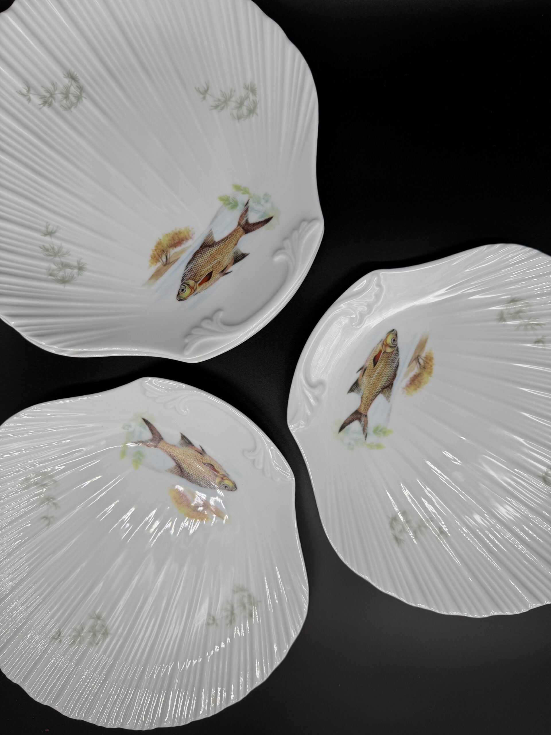 Limoges porcelianas – tai aukštos kokybės kietojo porceliano gamyba iš Prancūzijos miesto Limoges, kur porceliano gamyba pradėjo augti jau XVIII a. dėl netoli esančių kaolino klodų ir nuo tada tapo vienu žymiausių Europos porceliano centrų. Limoges porceliano kriauklės formos pietų lėkštės išsiskiria subtilia, elegantiška forma, primenančia natūralų jūros kriauklės kontūrą, ir rankomis dekoruotais žuvų motyvais. Autentiški Limoges porceliano dirbiniai yra vertinami dėl jų plono, baltos spalvos, atspindinčio šviesą, ir rafinuoto paviršiaus, kuris puikiai dera tiek kasdienybėje, tiek elegantiškose vakarienėse. Rinkinį sudaro 6 vienetai.