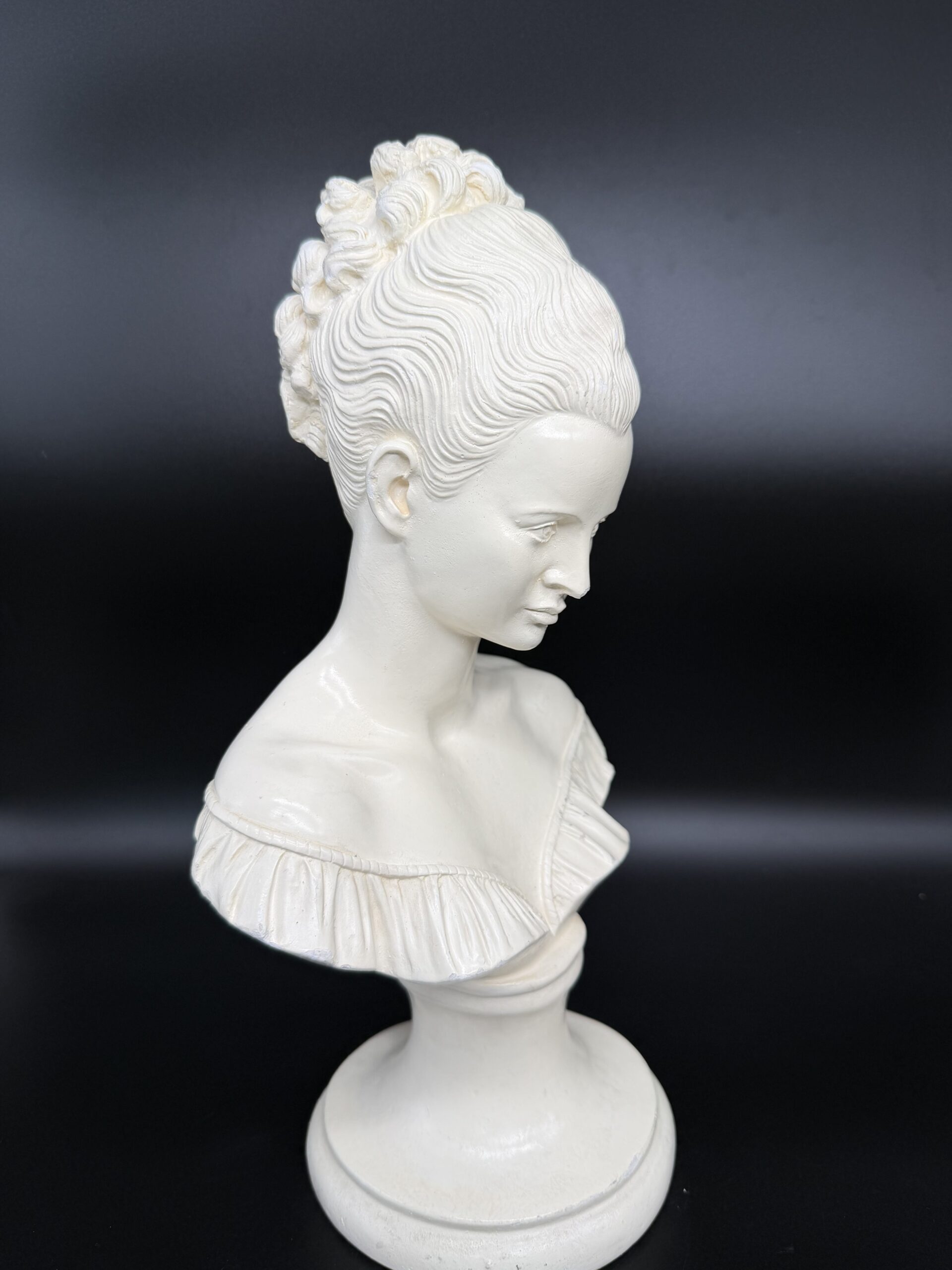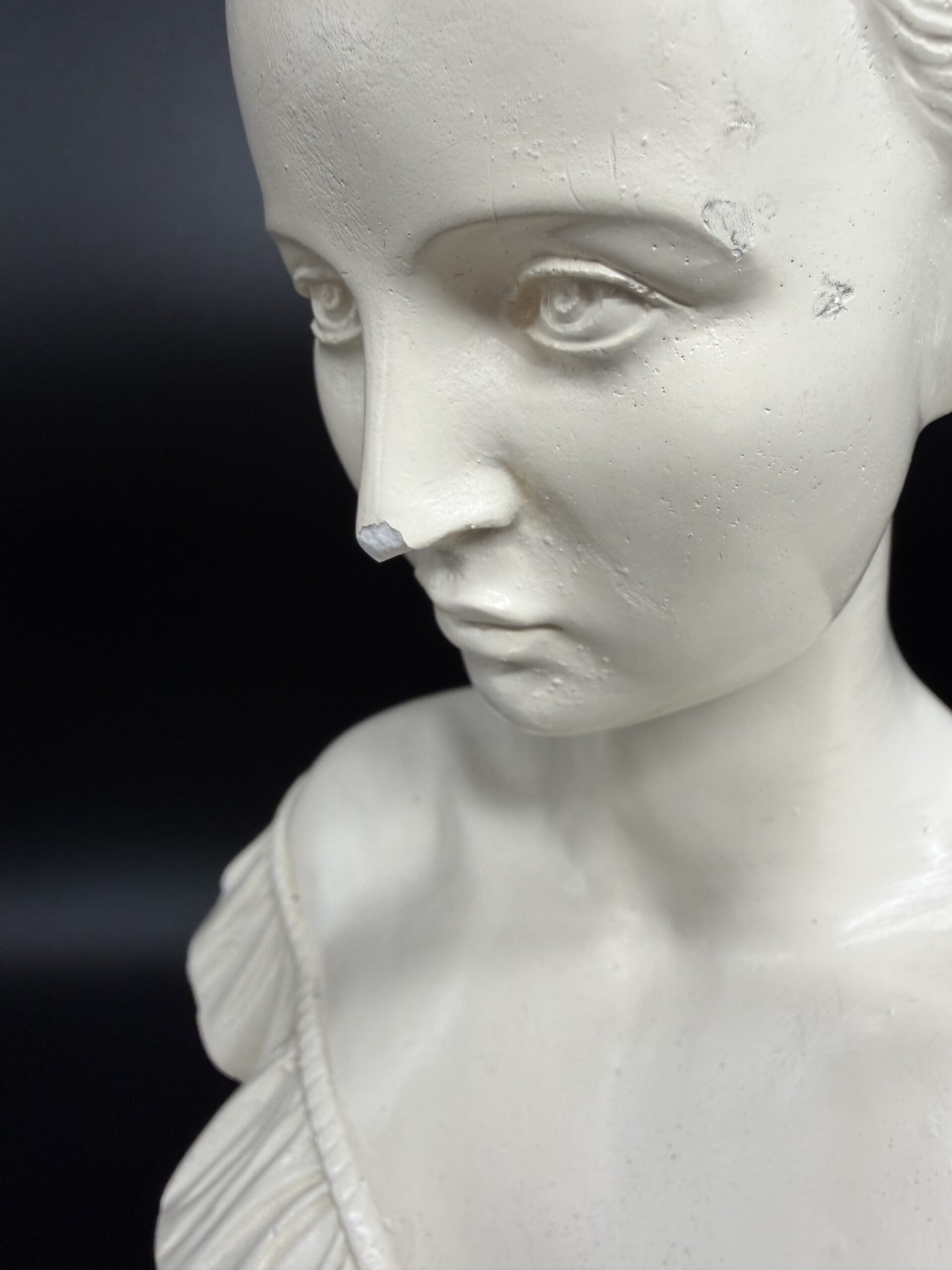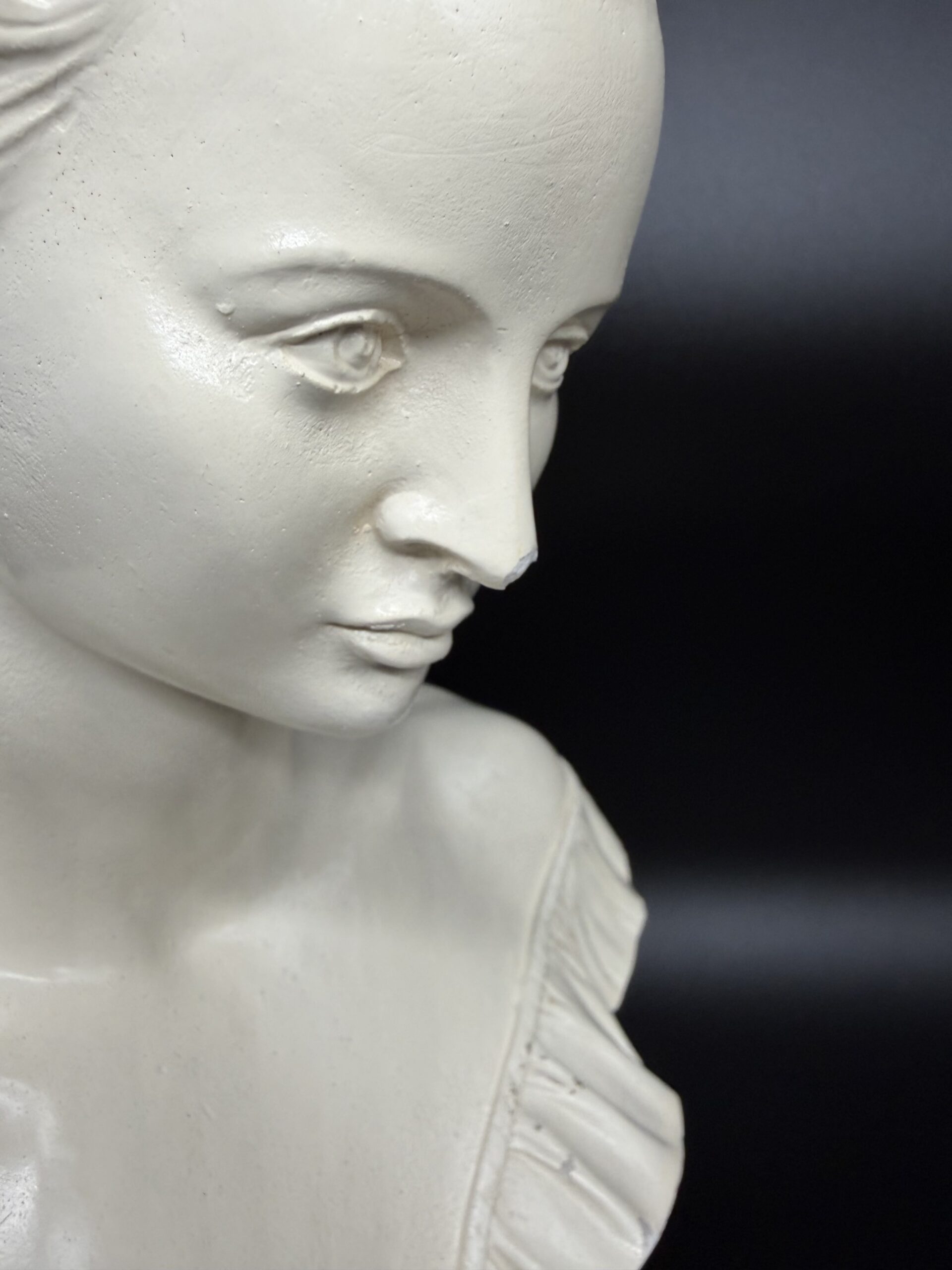 Alebastro akmuo, pasižymintis švelniu pieno baltumo atspalviu ir lengvu skaidrumu, suteikia biustui ypatingo švytėjimo. Šviesa, krisdama ant paviršiaus, sukuria minkštus šešėlius, pabrėžiančius veido bruožų grakštumą – švelniai nuleistas akis, lengvai pravertas lūpas, subtiliai modeliuotus skruostikaulius.