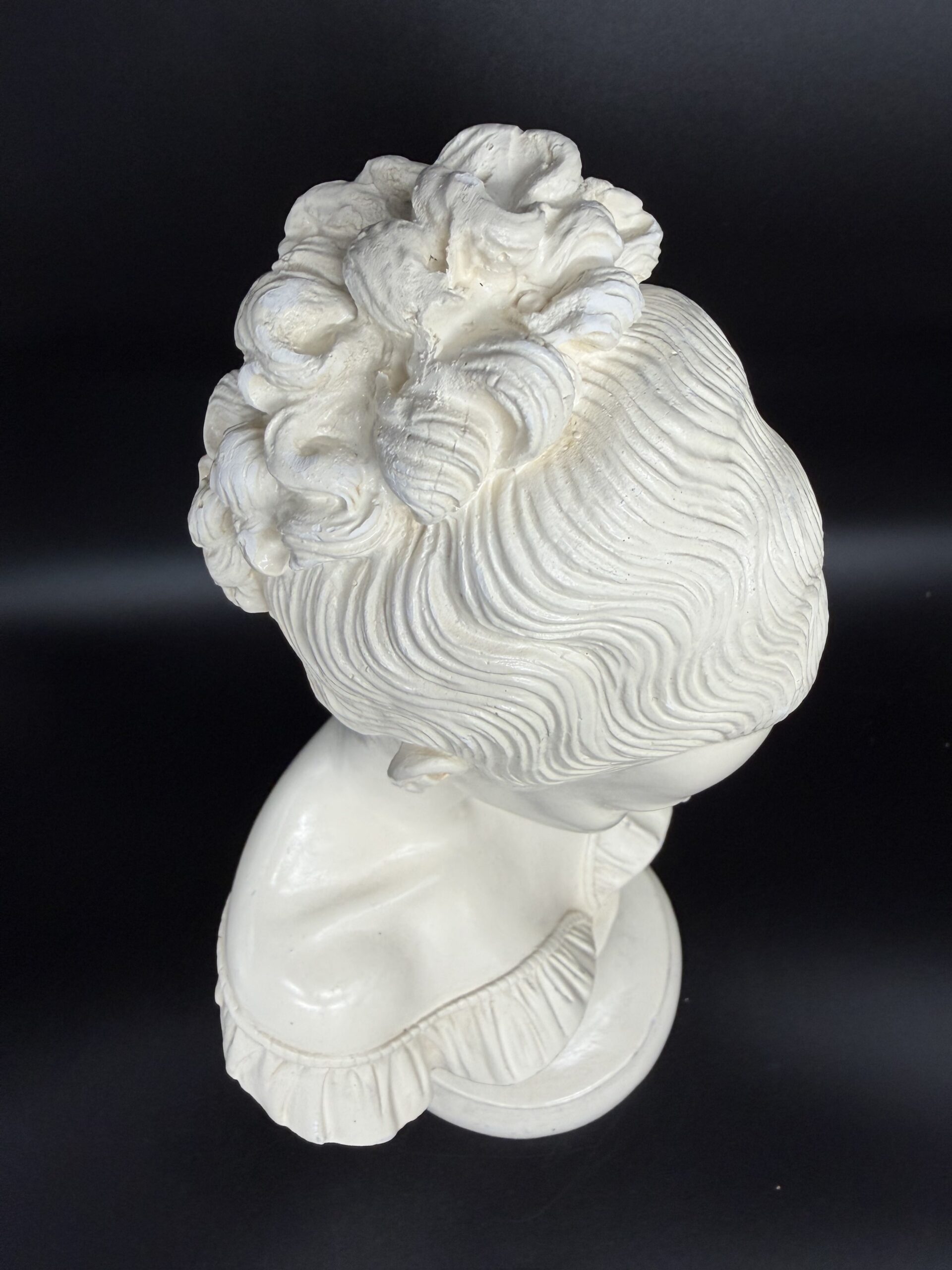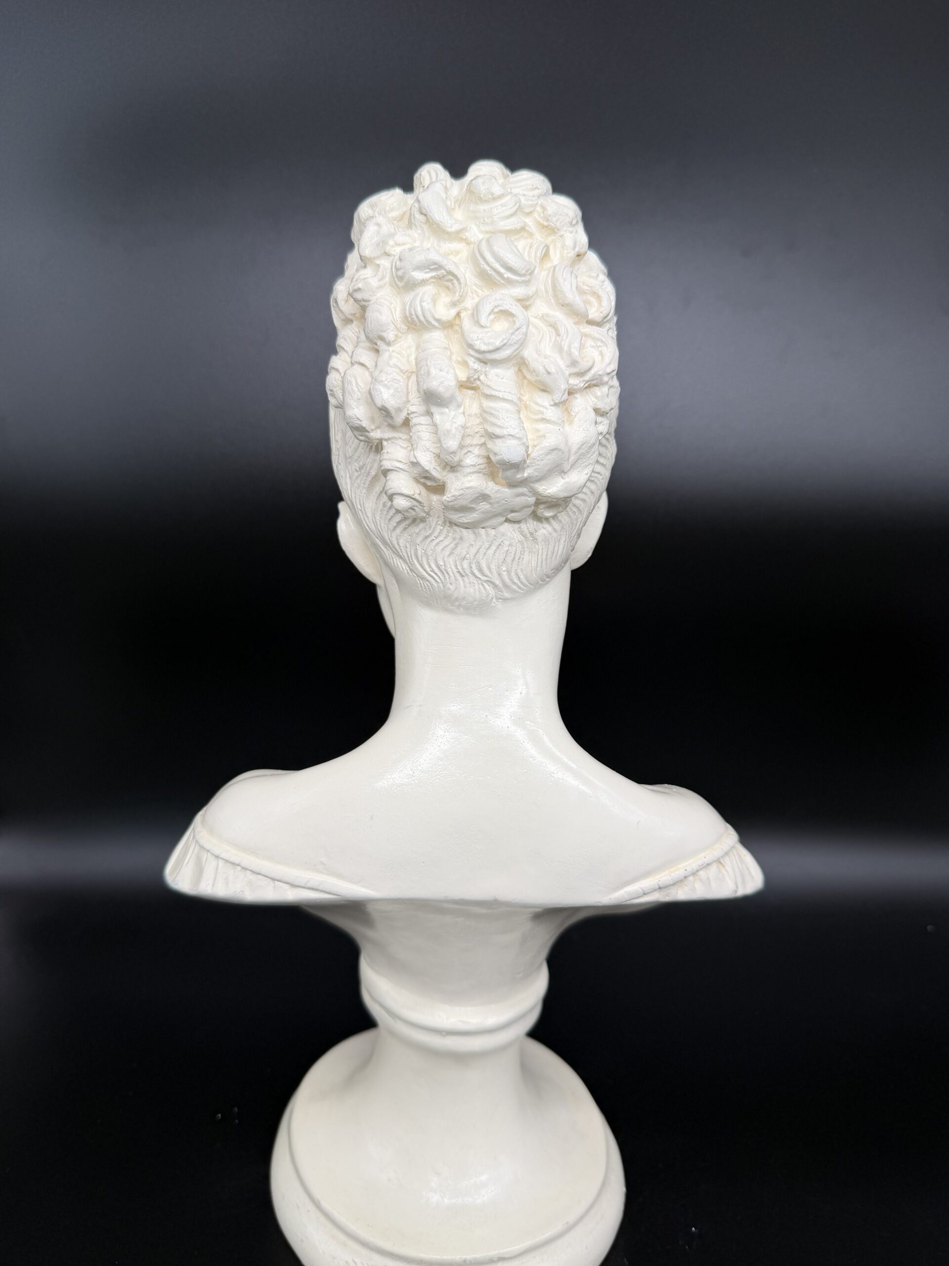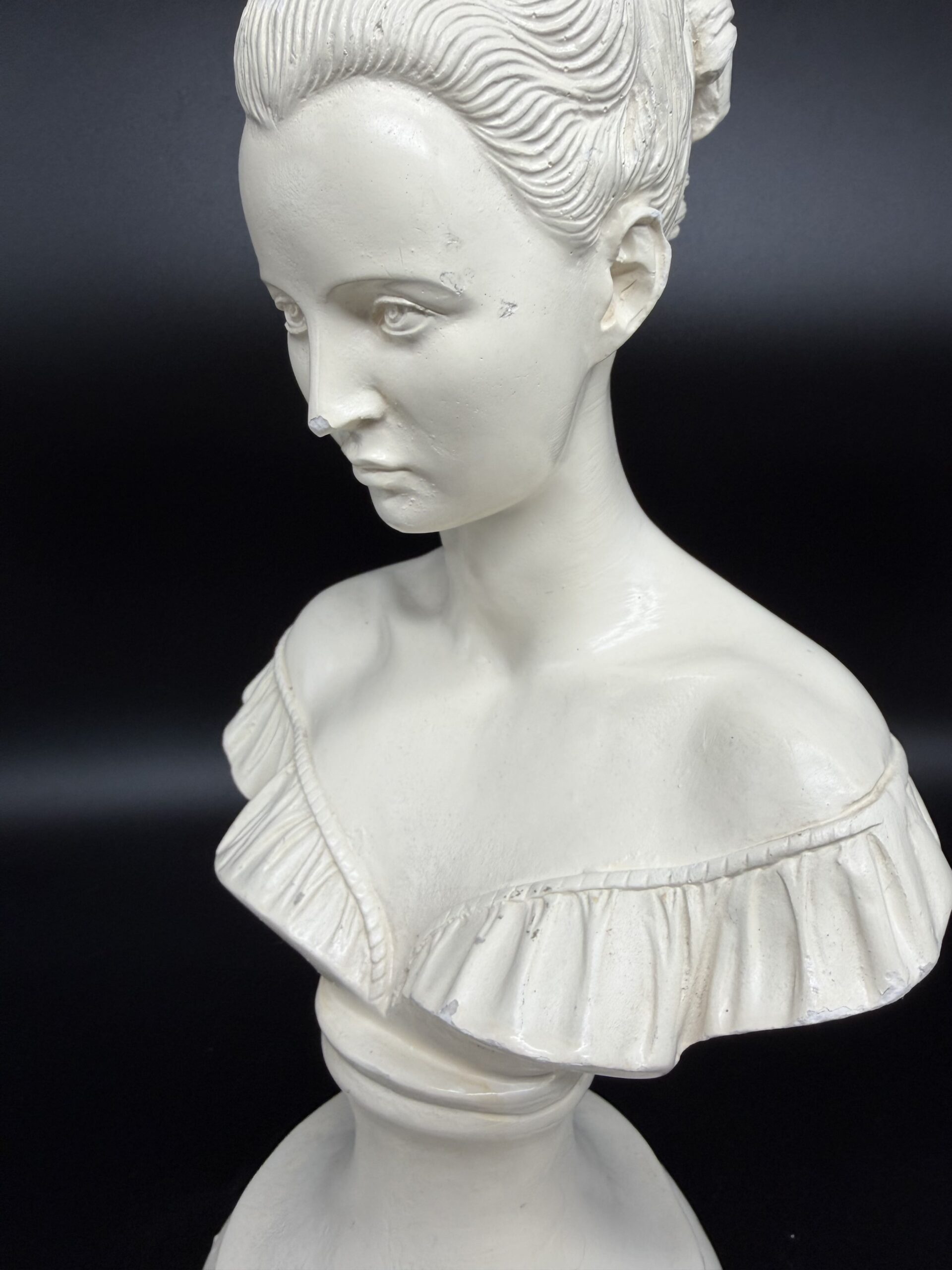 Alebastro akmuo, pasižymintis švelniu pieno baltumo atspalviu ir lengvu skaidrumu, suteikia biustui ypatingo švytėjimo. Šviesa, krisdama ant paviršiaus, sukuria minkštus šešėlius, pabrėžiančius veido bruožų grakštumą – švelniai nuleistas akis, lengvai pravertas lūpas, subtiliai modeliuotus skruostikaulius.
