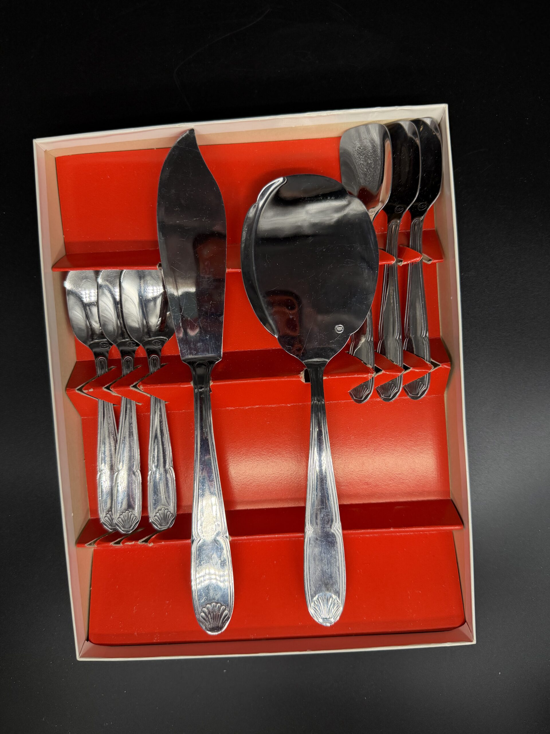 Stilingas ir praktiškas desertinių įrankių rinkinys, pagamintas iš nerūdijančio plieno. Rinkinį sudaro šeši desertiniai šaukšteliai ir du torto serviravimo įrankiai – peilis bei mentelė.