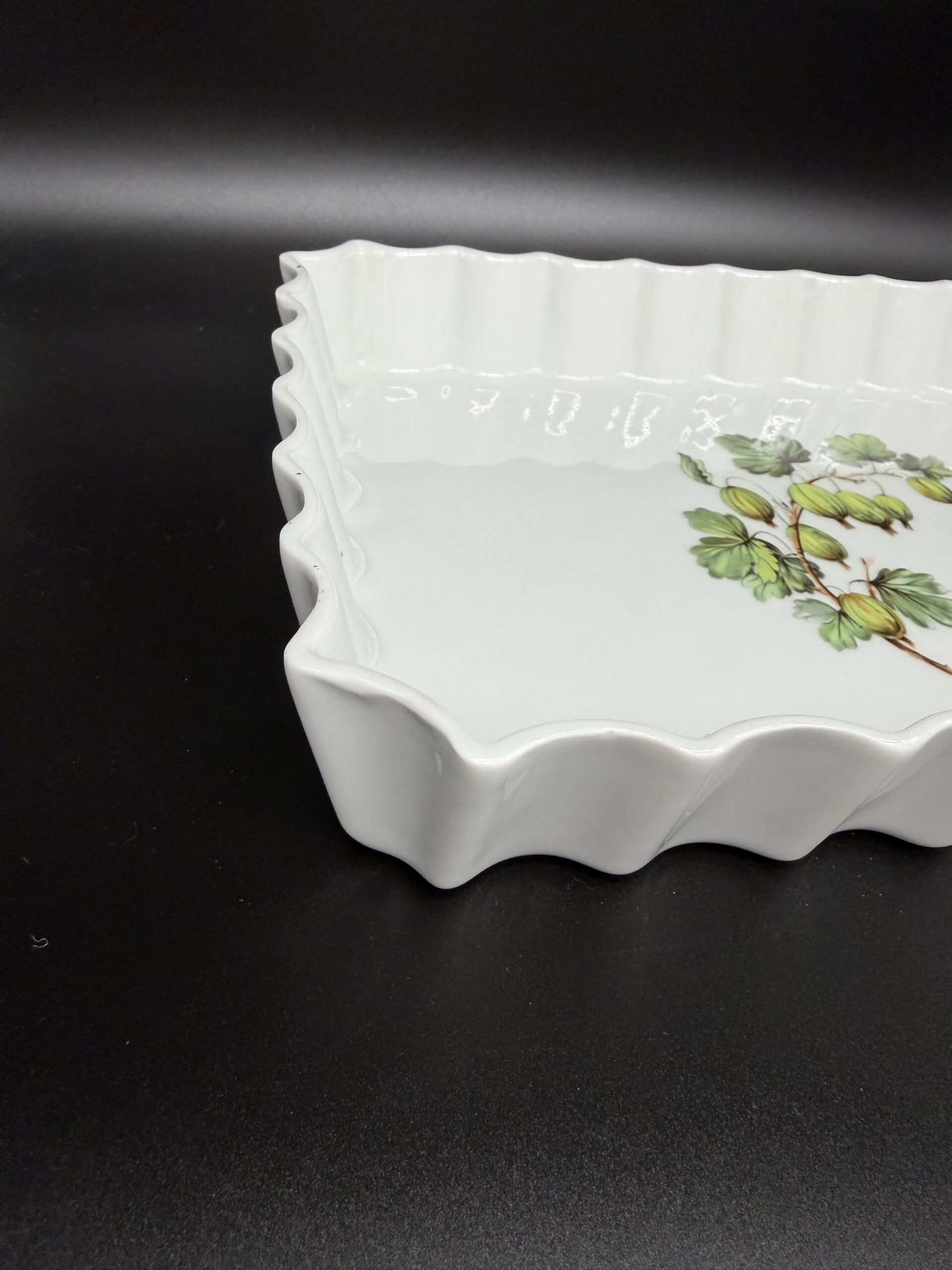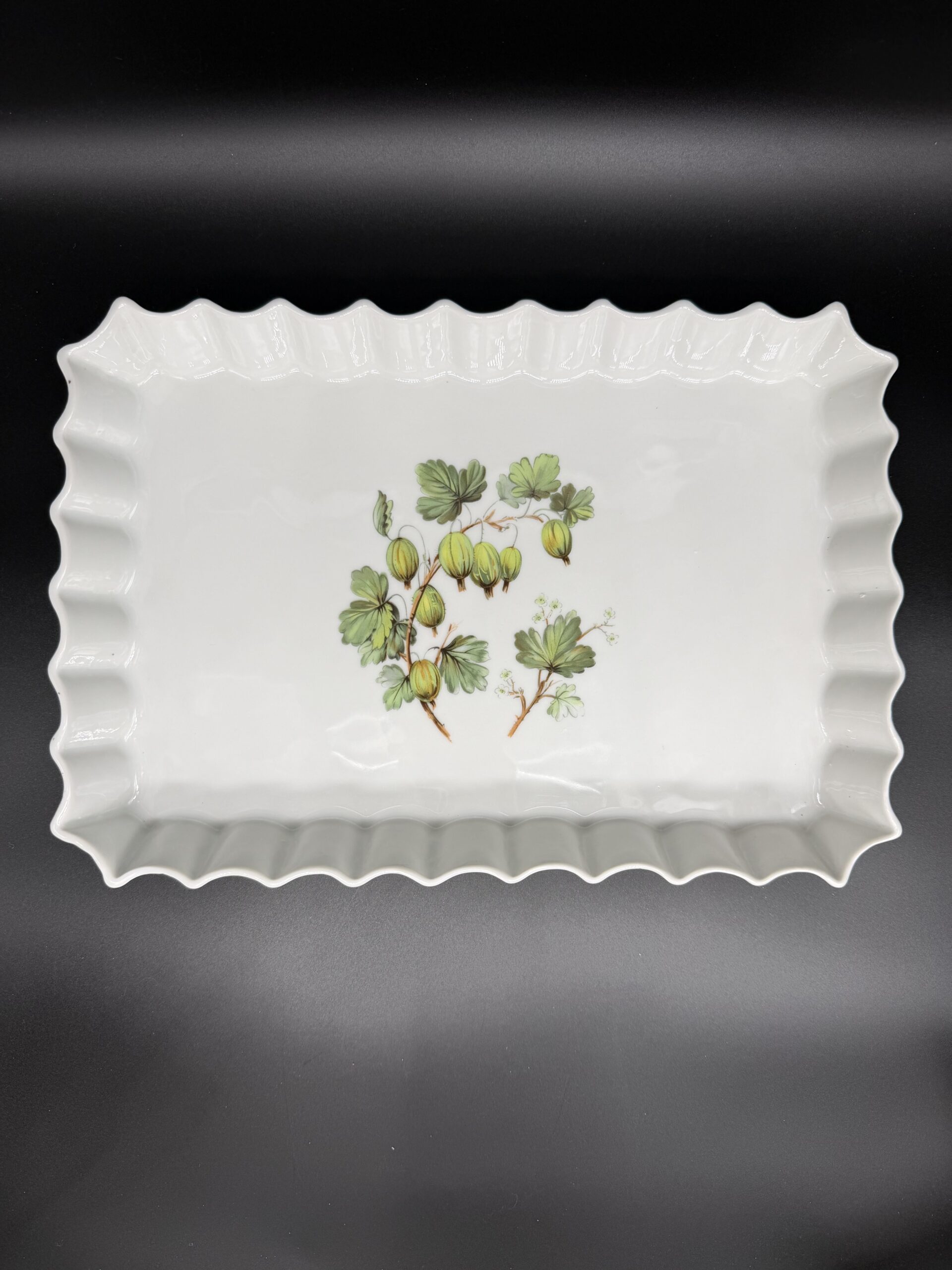 Elegantiškas porcelianinis kepimo indas su išraiškingais banguotais krašteliais – tai subtili klasikos ir prancūziško žavesio dermė. Indo centre puikuojasi agrastų piešinėliai, suteikiantys gaminiui lengvo vasariško gaivumo ir išskirtinio charakterio. Aukštos kokybės porcelianas užtikrina tolygų karščio pasiskirstymą, todėl indas puikiai tinka apkepams, pyragams ar kitoms orkaitėje ruošiamosioms gėrybėms. Jis ne tik praktiškas, bet ir pakankamai dekoratyvus, kad iš orkaitės keliautų tiesiai ant stalo.