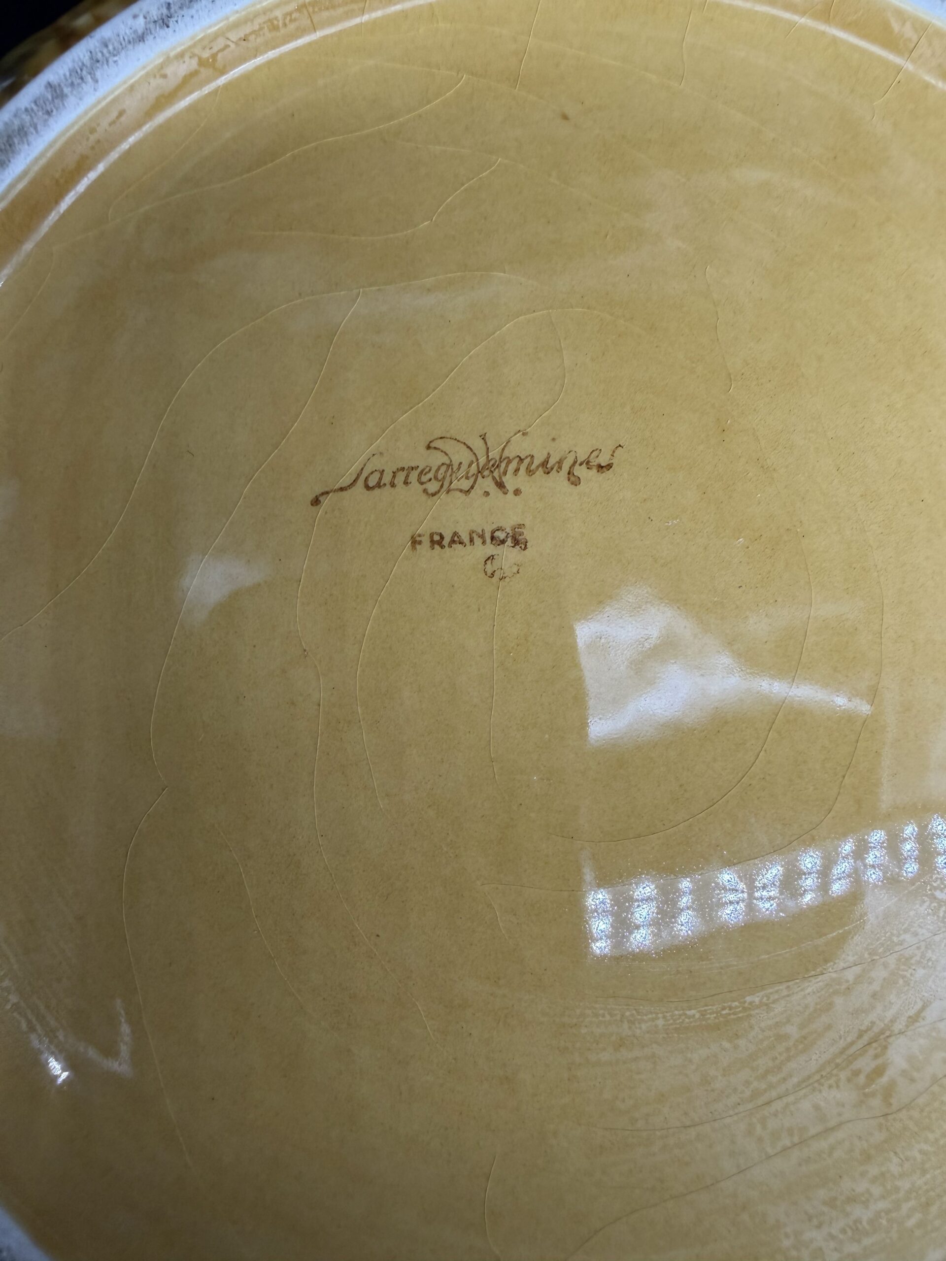 Spalvingas Sarreguemines dubuo – puikus prancūziškos fajanso keramikos pavyzdys, dekoruotas sodriu majolikos stiliaus ornamentu su vaisių motyvais. Ryškios glazūros spalvos ir reljefinis piešinys suteikia indui gyvumo bei dekoratyvumo, būdingo XIX a. pabaigos–XX a. pradžios gaminiams. Toks dubuo ne tik praktiškas, bet ir išraiškinga stalo ar interjero puošmena, vertinama kolekcininkų. Turi nuskilimą, žr. nuotraukas.