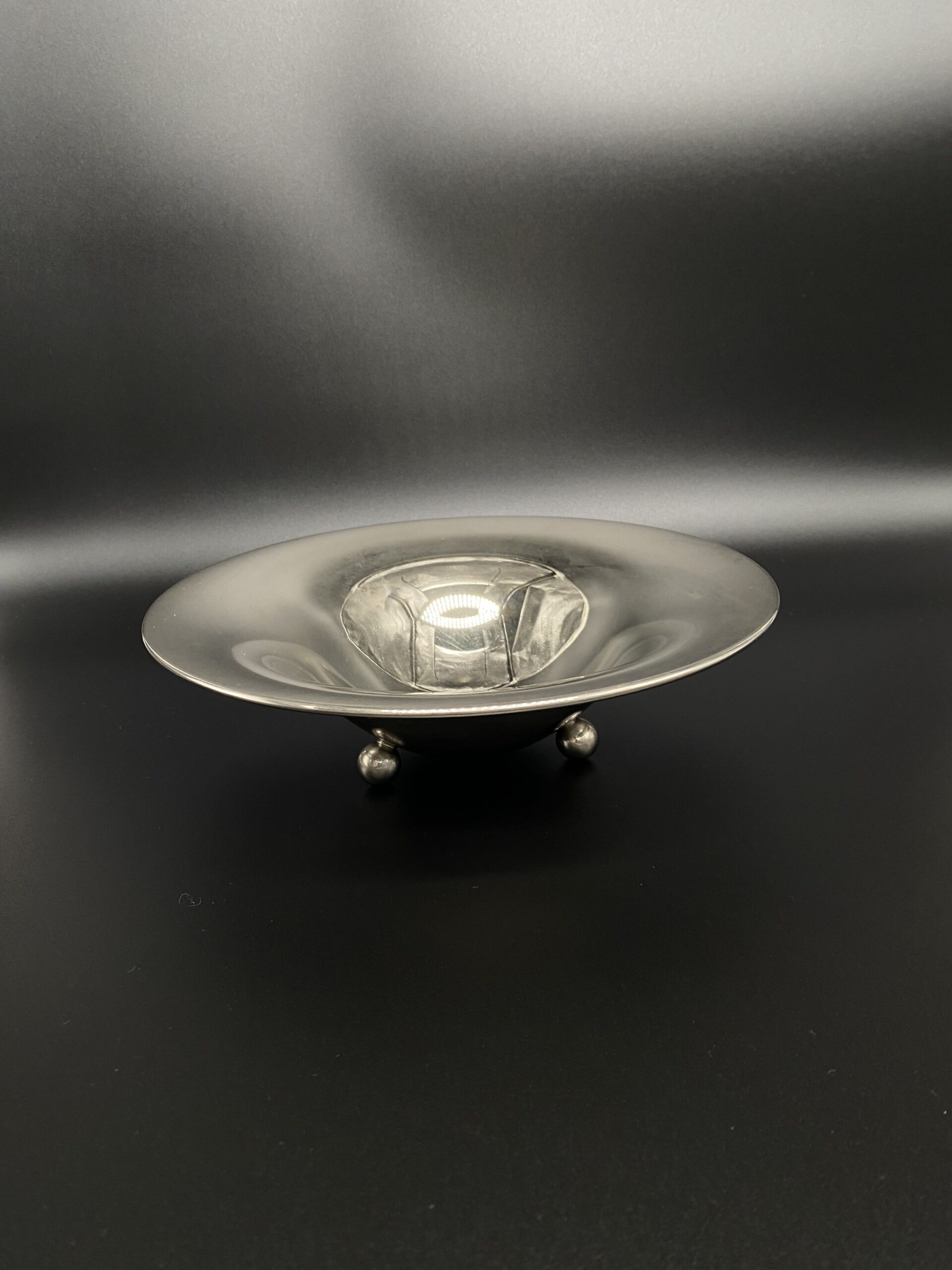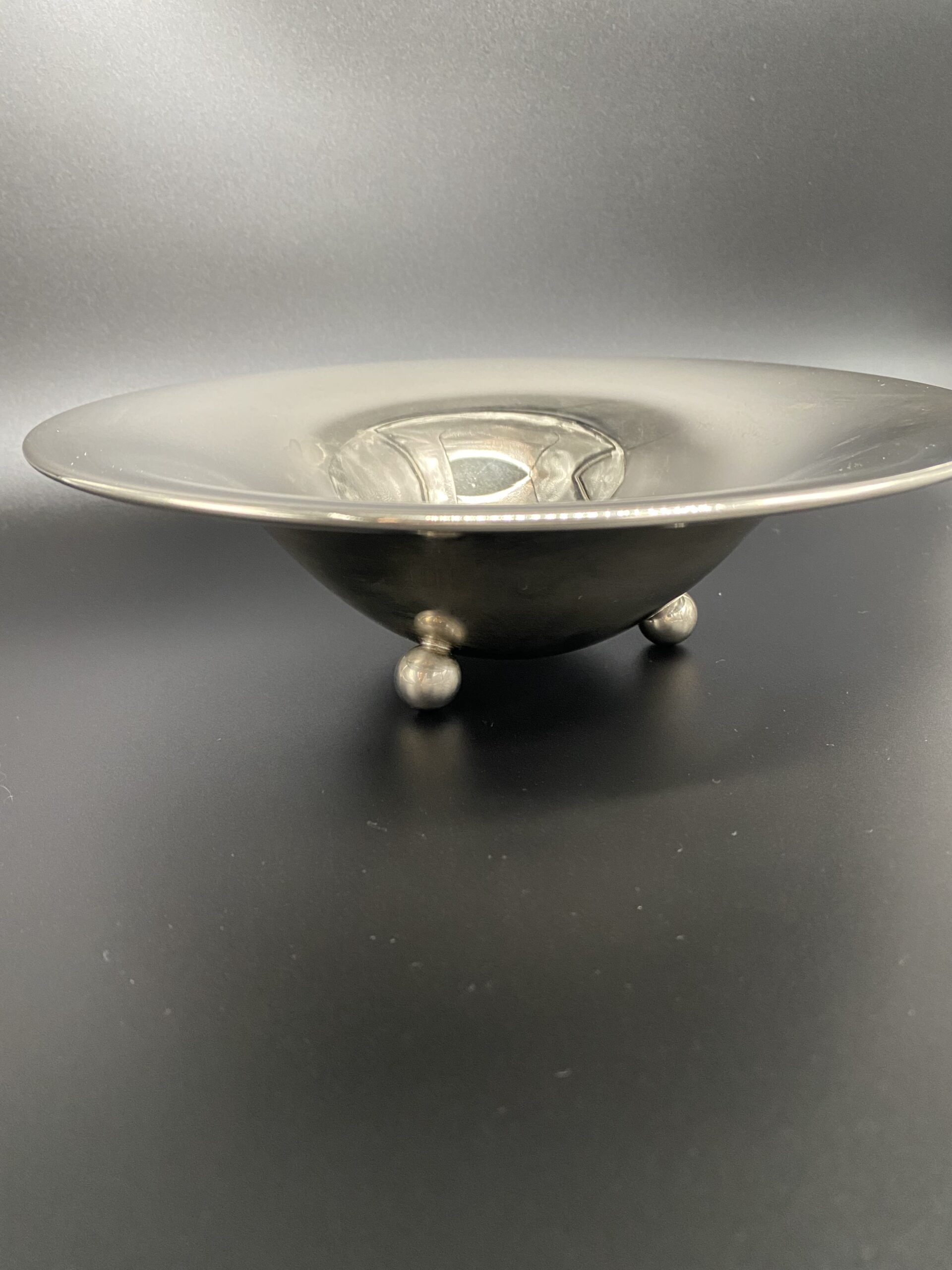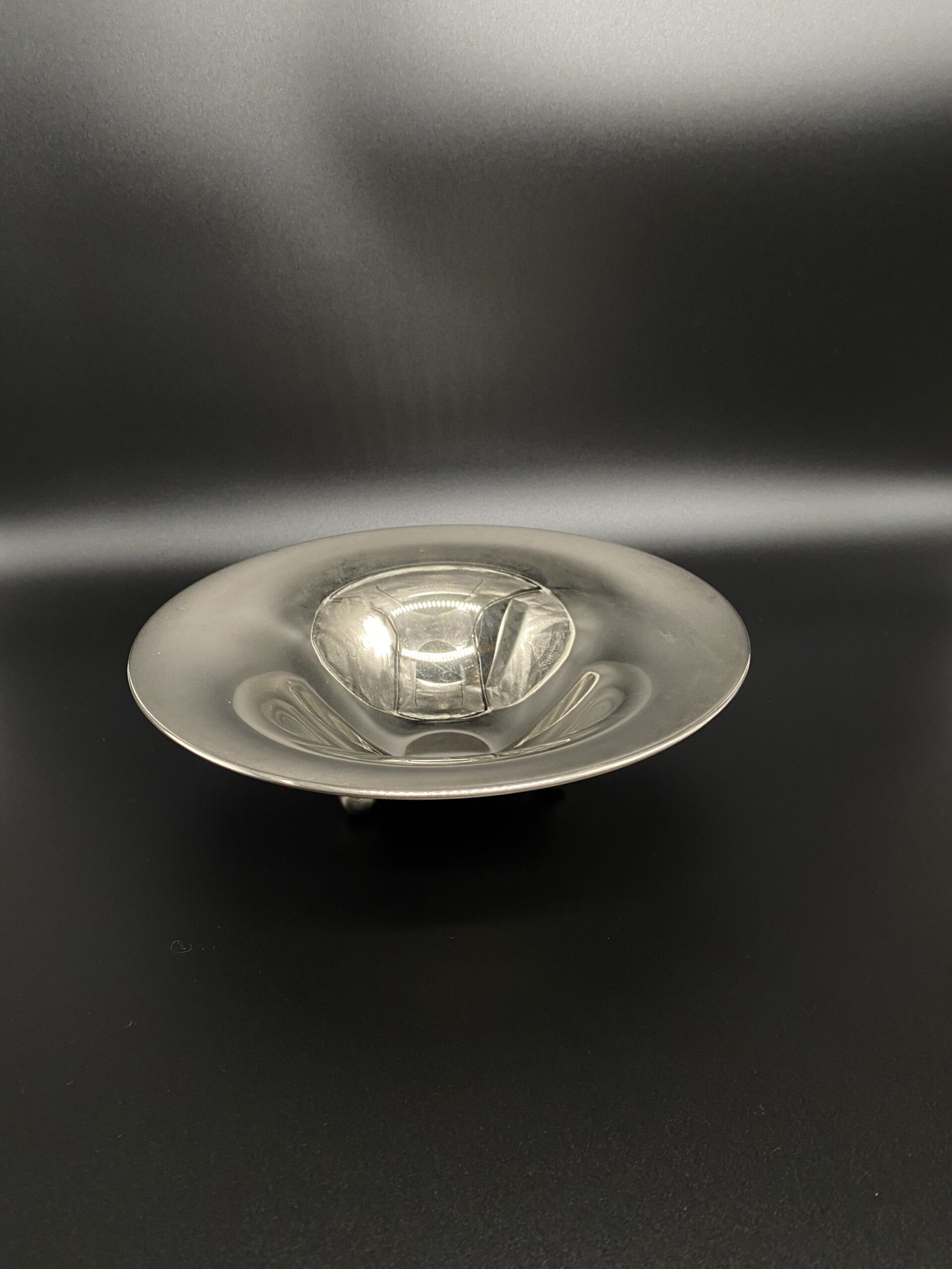 Mid Century stiliaus sidabruotas dubuo ant kojelių. Tokio tipo indai skirti vaisiams, saldumynams serviruoti, bet atrodo gražiai tiesiog be nieko, kaip dekoro detalė. Paskutinėje nuotraukoje matosi defektas.