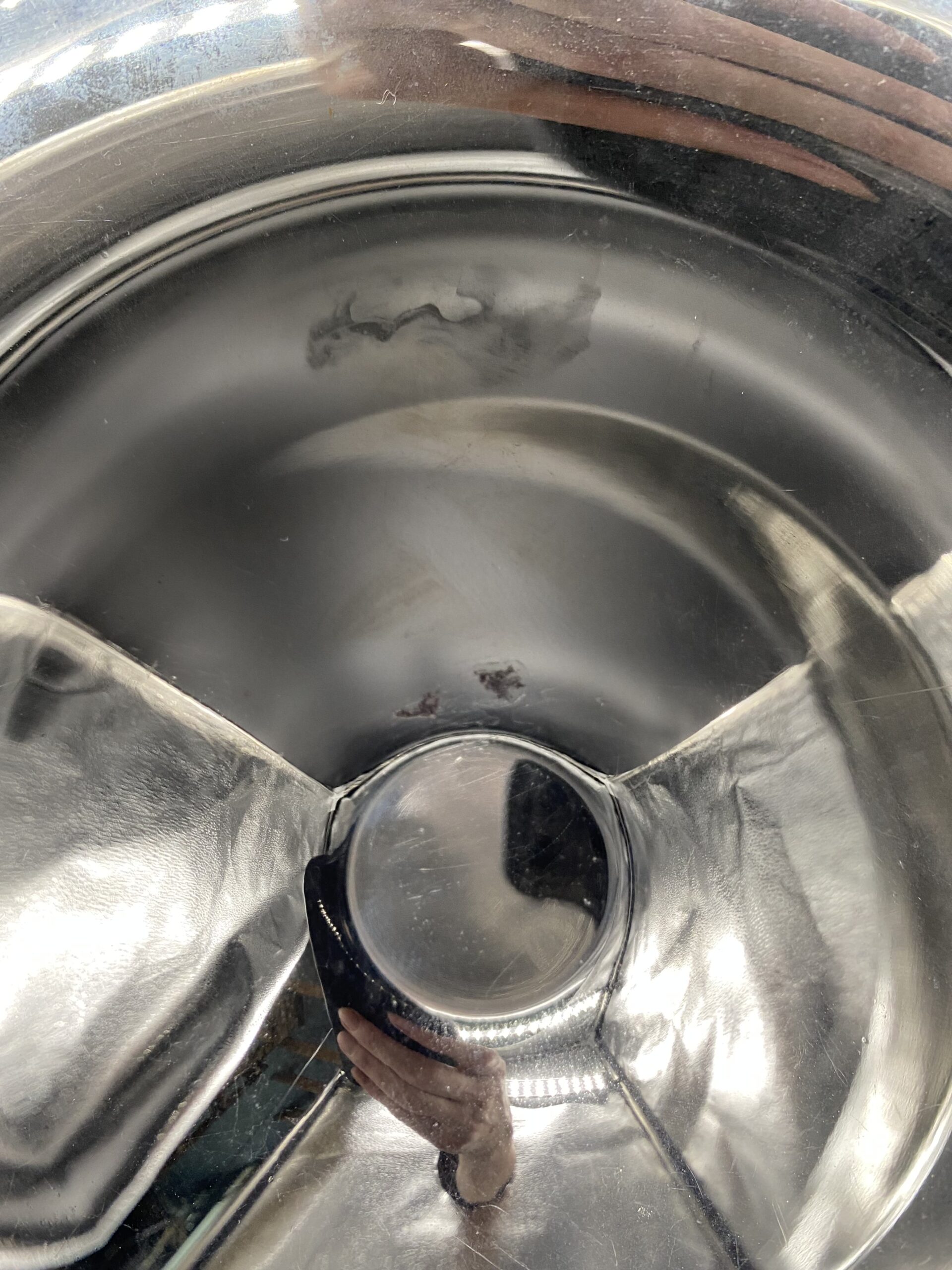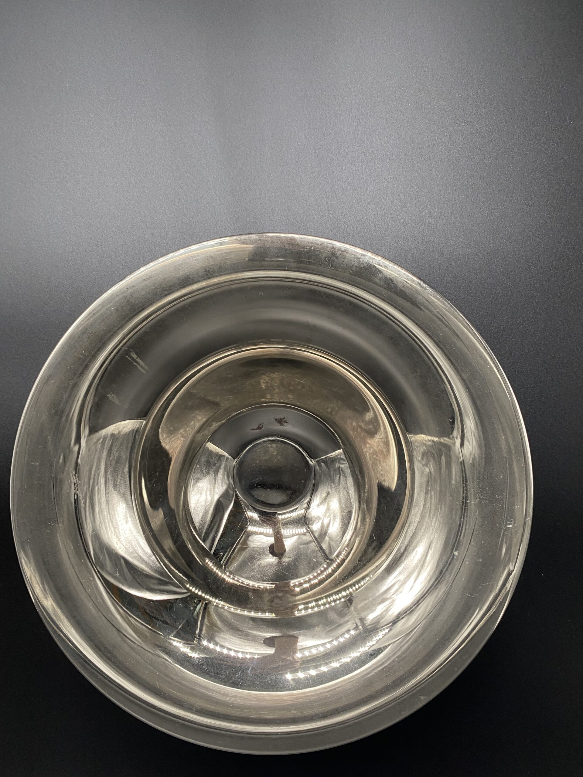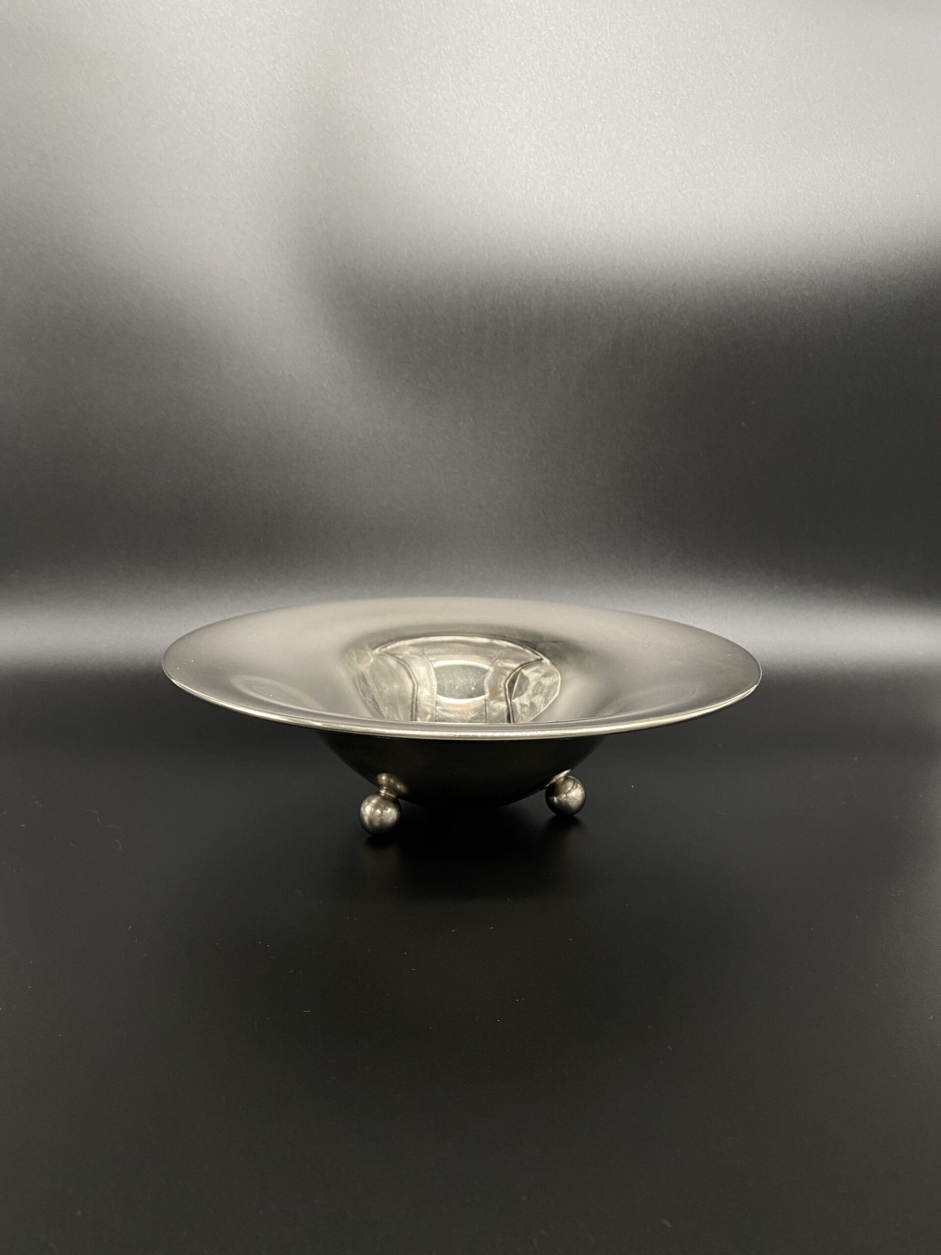Mid Century stiliaus sidabruotas dubuo ant kojelių. Tokio tipo indai skirti vaisiams, saldumynams serviruoti, bet atrodo gražiai tiesiog be nieko, kaip dekoro detalė. Paskutinėje nuotraukoje matosi defektas.