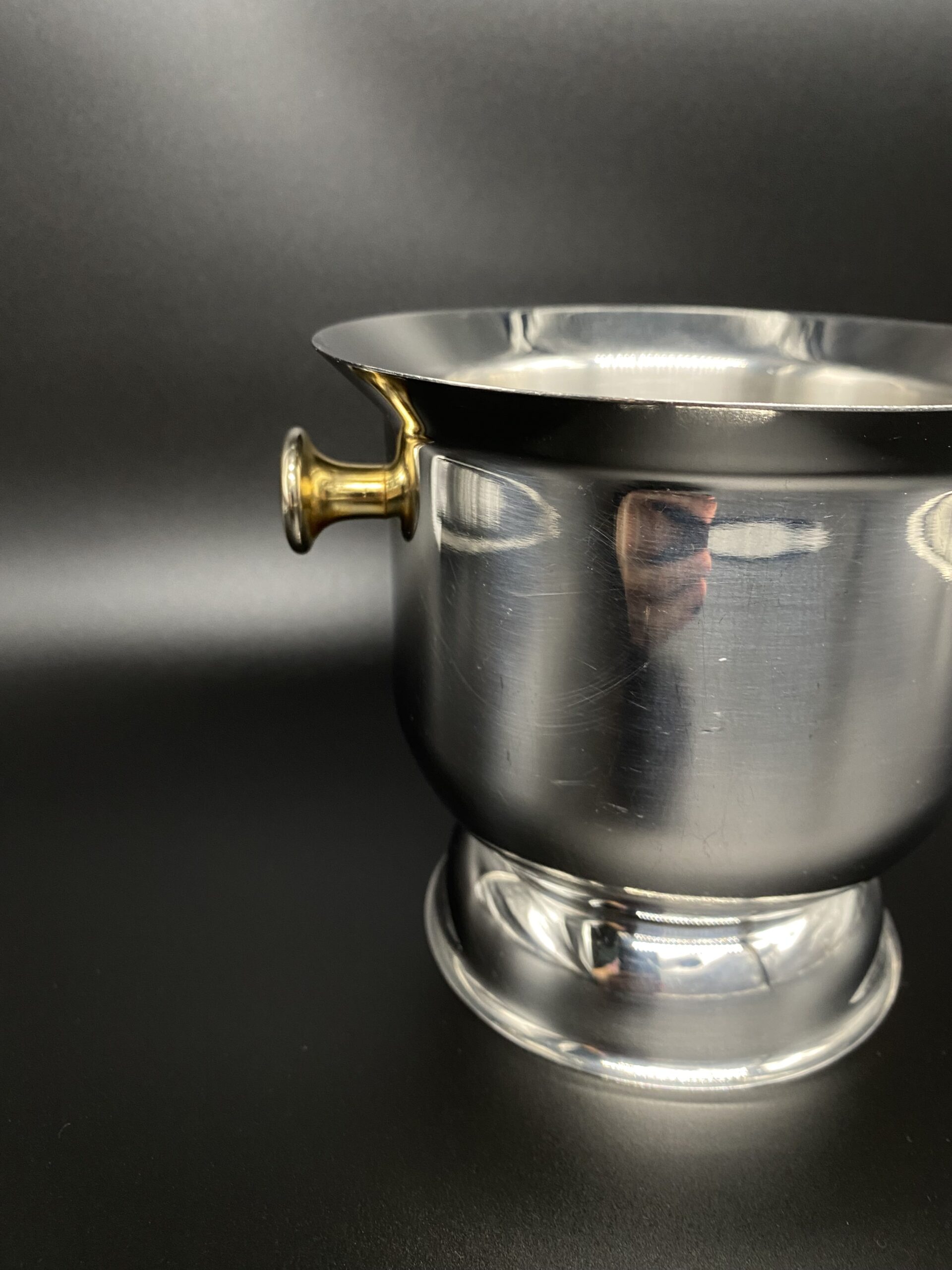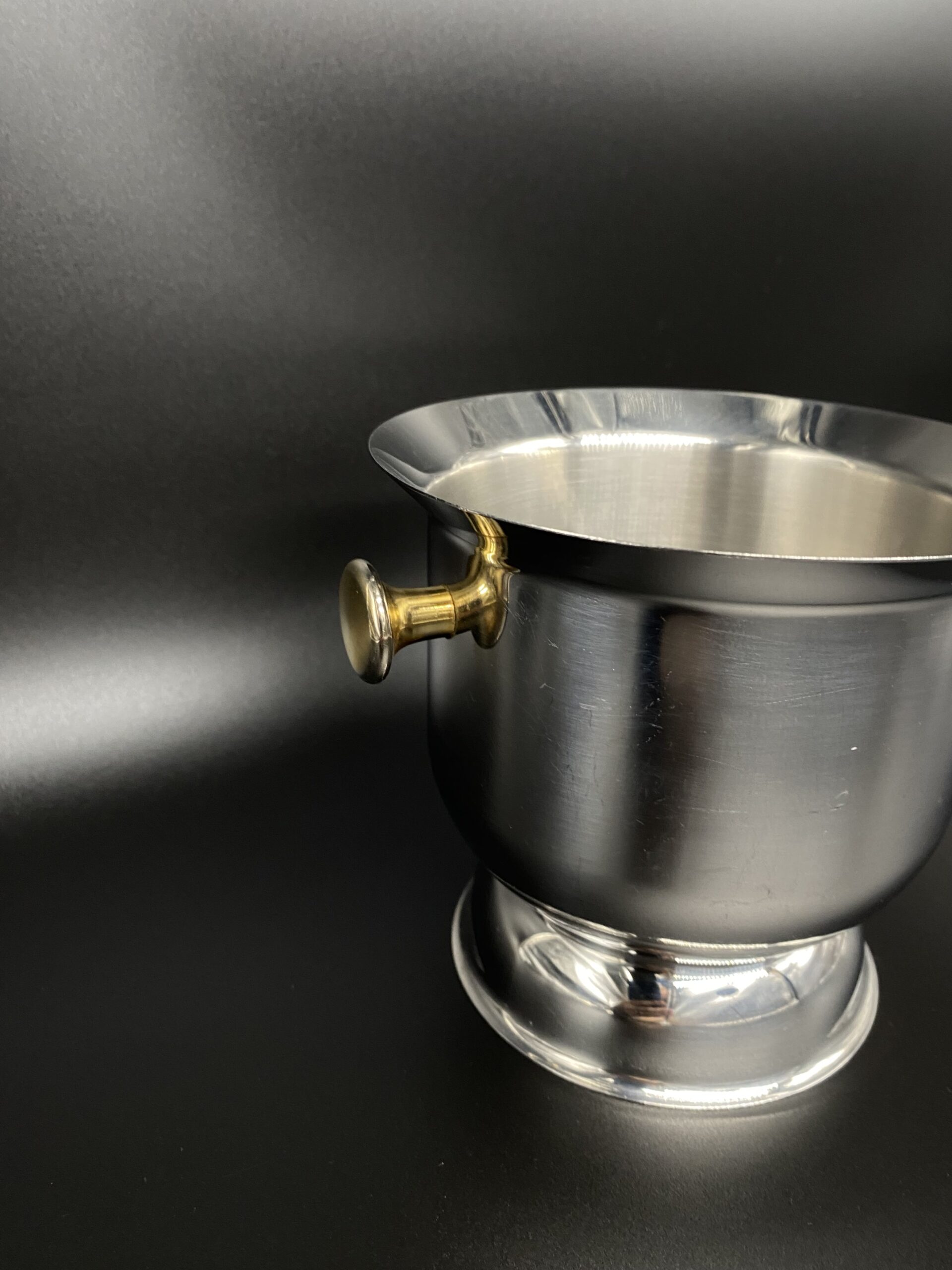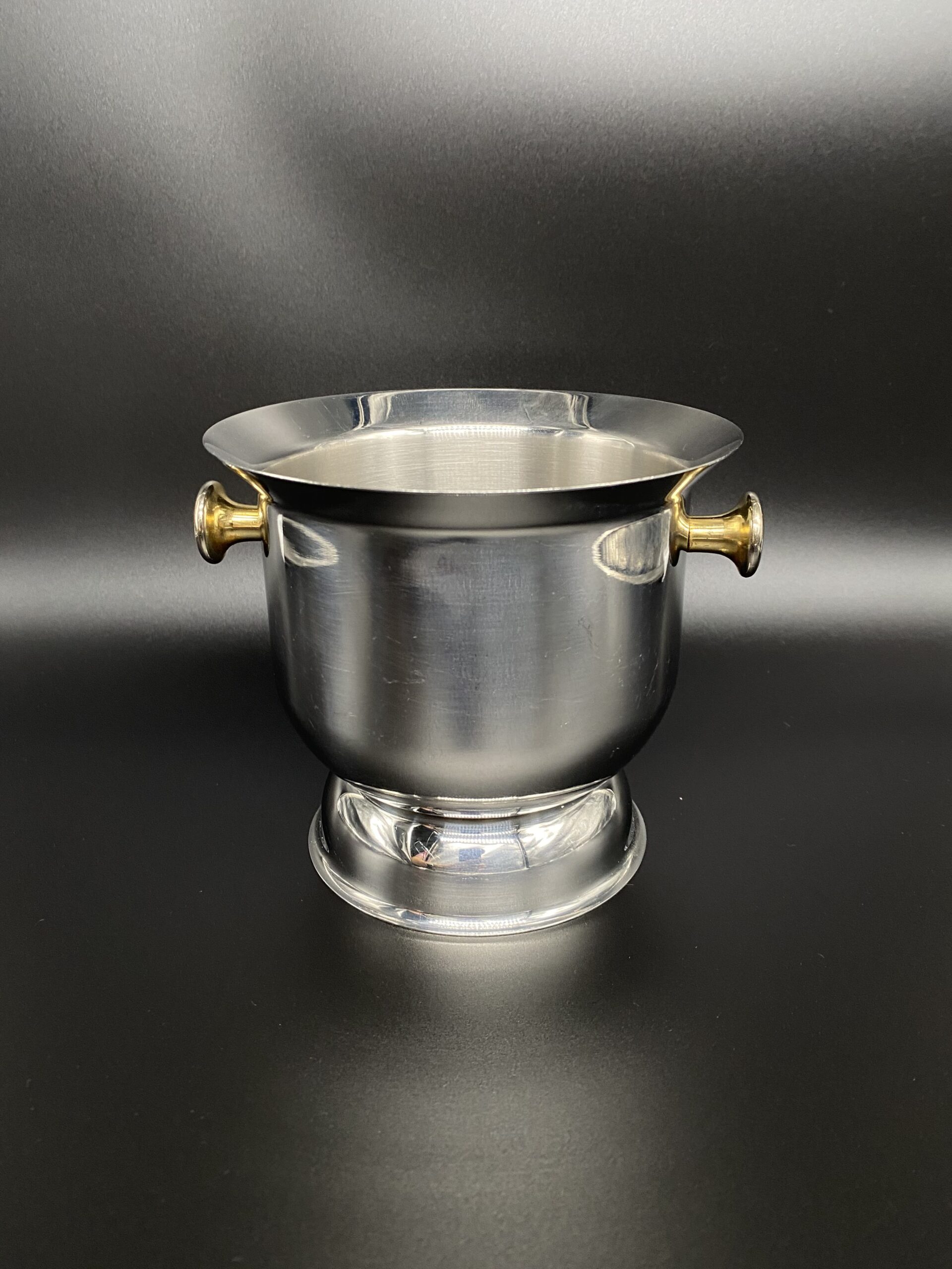 Space Age dizaino ledukų kibirėlis. Nerūdijančio plieno su aukso spalvos rankenėlėmis. Turi žymėjimą ant dugno, pagaminta Italijoje.